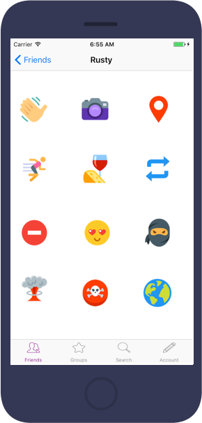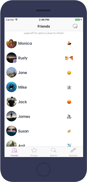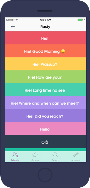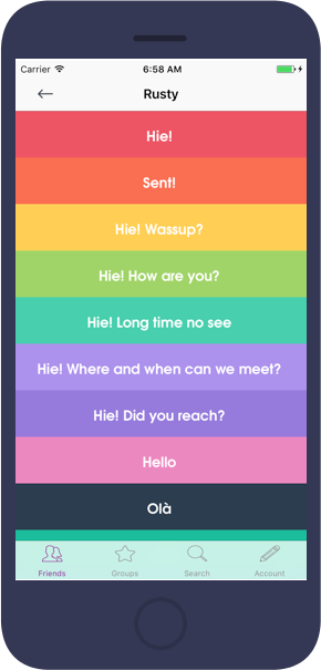 Hie! Introducing Hie Chat. Hie is an app that allows you to Know What Your Friends are Doing and to Chat Without Typing. Hie was built out of a personal need to communicate quickly and in a fun manner. Please feel free to add me as a friend on Hie. My username is Rusty Chat Flow: ---------- 1. Pick a Friend / Group 2. Pick an Option - Pics, Location, GIFs, Replies, Rants, Love, Angry Busy etc 3. Tap to Send Features: 1. Chat to Users or Groups 2. Pick Predefined messages based on topics such as Replies, Food, Busy, Angry Rants etc 3. Send GIFs to communicate 4. Send Locations 5. Get Creative. Express yourself using Pics and the inbuilt photo editor 6. Tell your friends what you are upto. Set your status using Emojis. Ps: This is a MVP. I plan on developing this further. Please feel free to email me on [email protected] regarding your thoughts, ideas and feedback Thanks Rusty :)