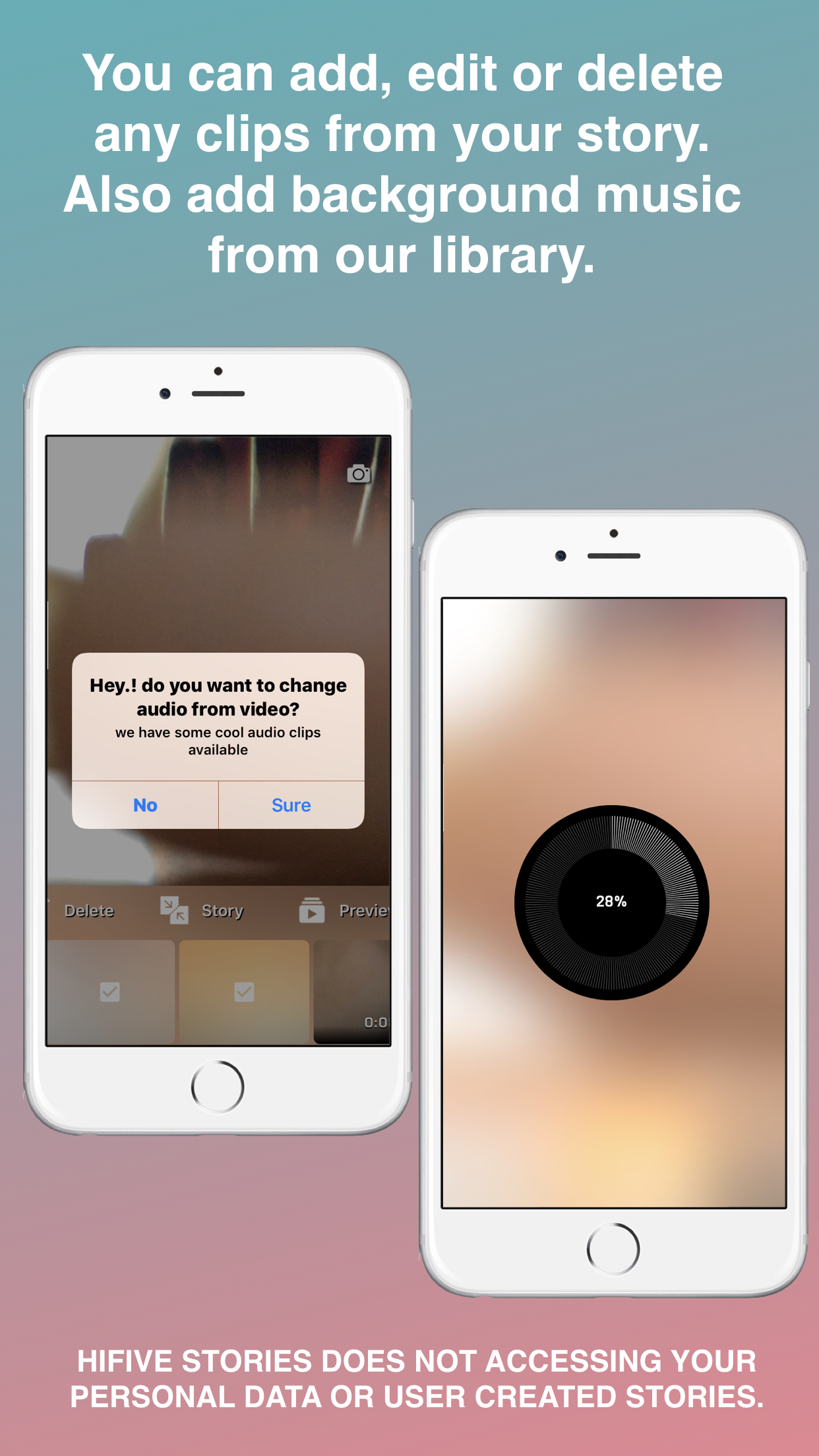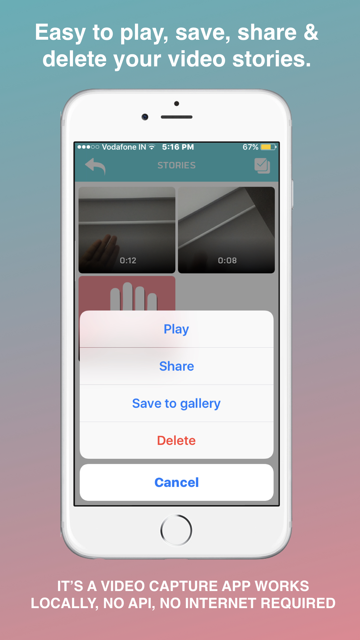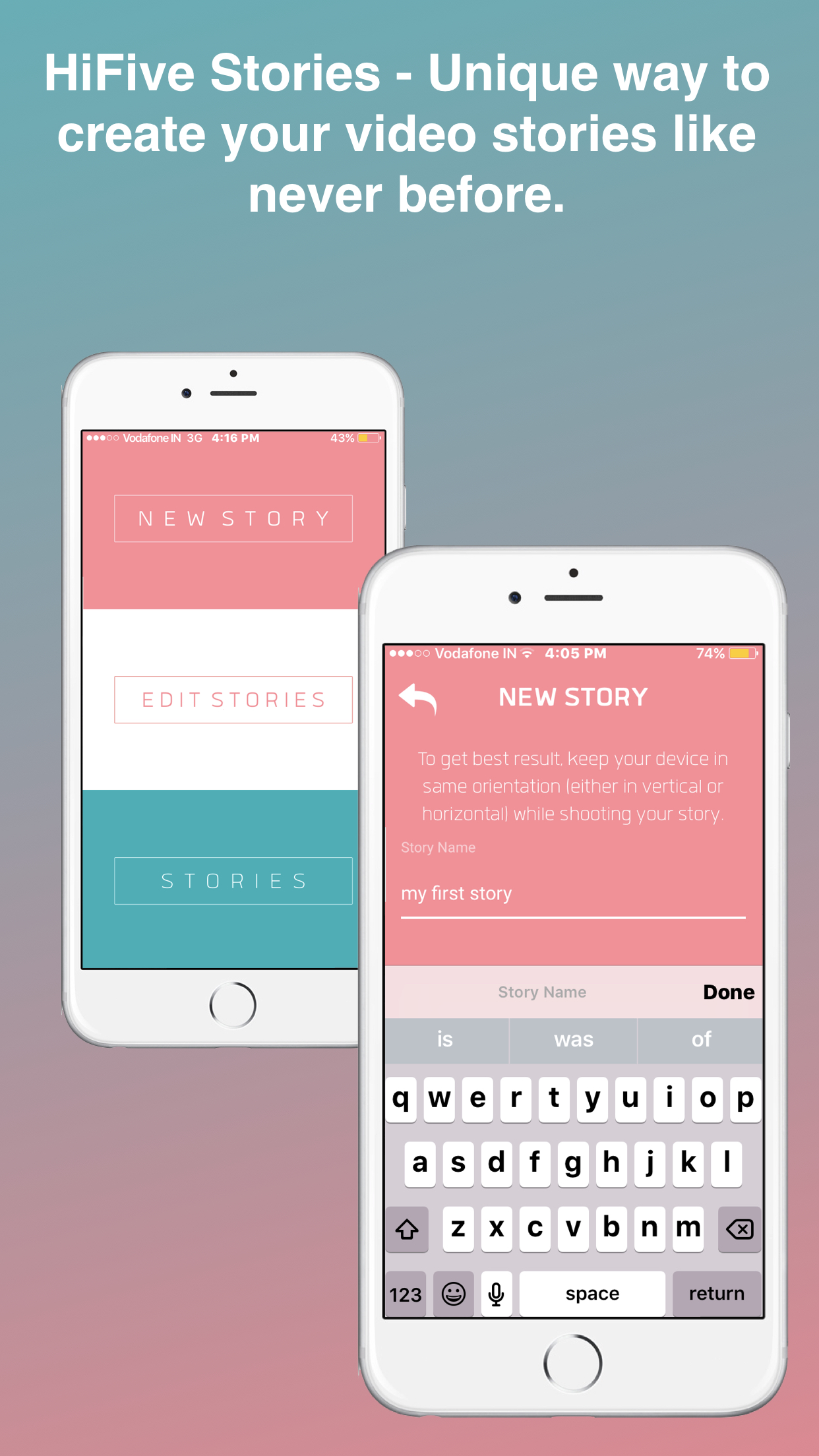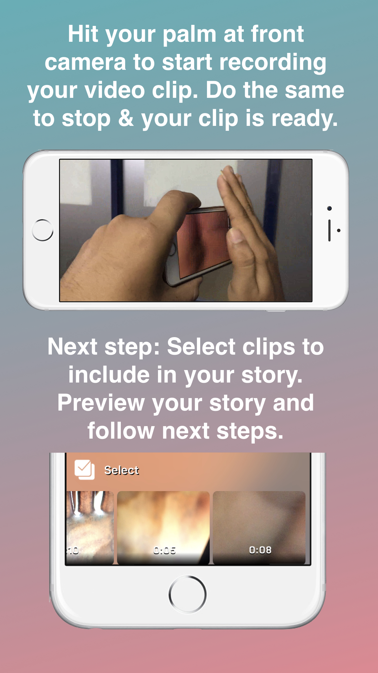 HiFive’s unique innovation will provide you the best visual effect while creating your video story. Here you just need to hit your palm on front camera and our app will automatically start shooting your video. Hit your palm again and your clip is ready. Now shoot different clips in the same way from different locations and combine them into stories. Hifive stories mobile application is available on Android & iPhone app store.