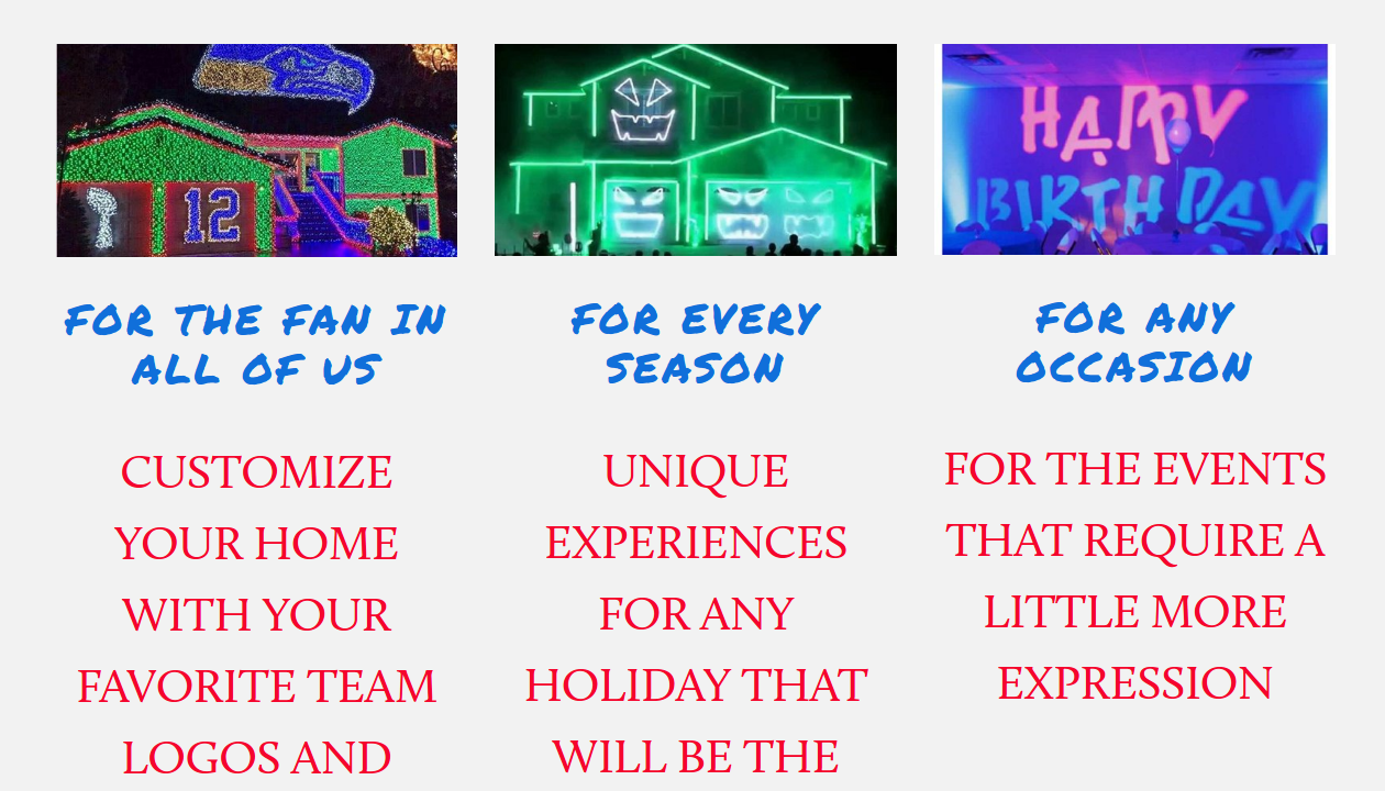 Your home is your canvas For the fan in all of US Customize your home with your favourite team logos and colors. For every season Unique experience for any holiday that will be the envy of the neighbourhood. For any ocassion For the events that require a little more expression.
