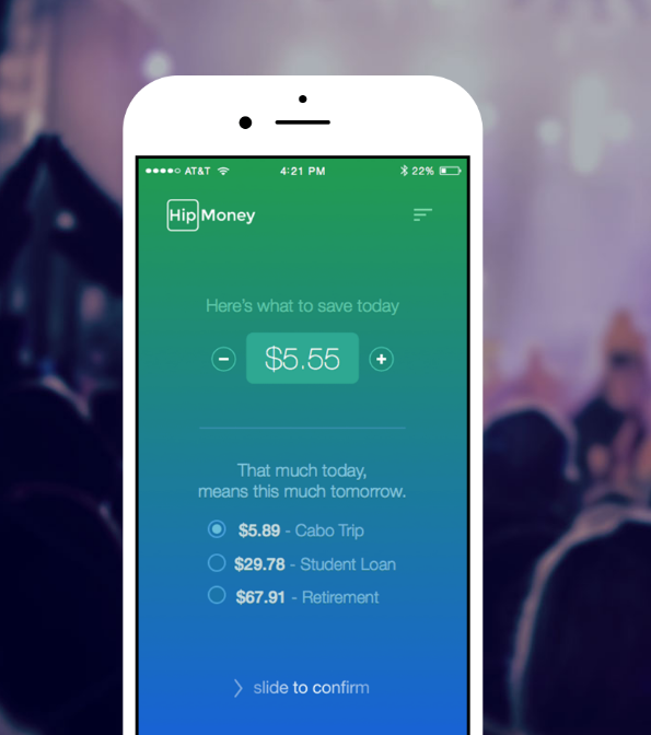 The Hip Money app helps you save more money & eliminate debt with a swipe right. To start, you simply connect the app to your checking account so we can analyze your cash flow, not to judge you but to gently nudge you you’re your customized savings recommendation. You then add in goals or existing debt and it helps you clearly understand what a small amount today can mean in the future toward each goal.