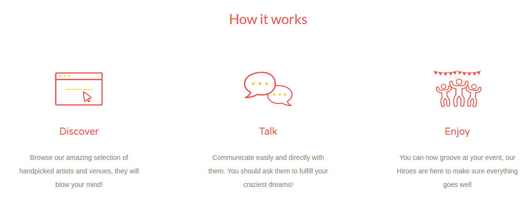Discover Browse our amazing selection of handpicked artists and venues, they will blow your mind! Talk Communicate easily and directly with them. You should ask them to fulfill your craziest dreams! Enjoy You can now groove at your event, our Hiroes are here to make sure everything goes well