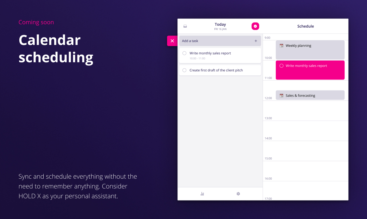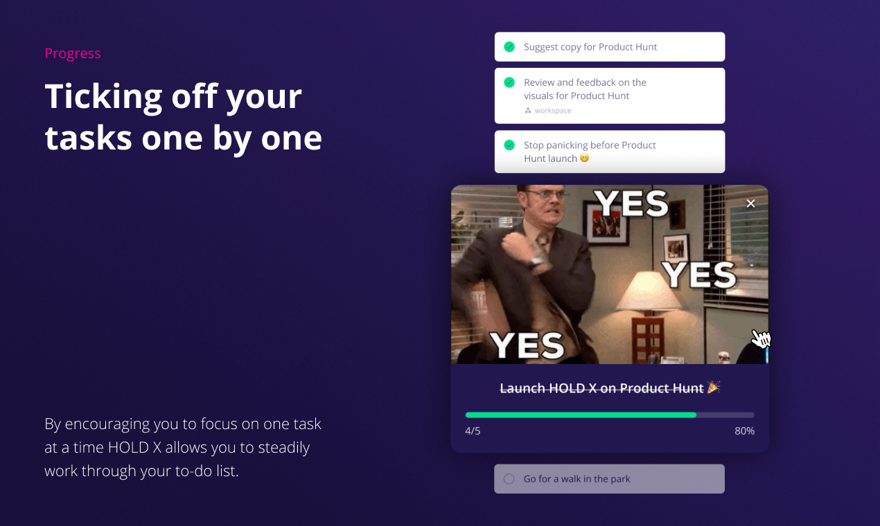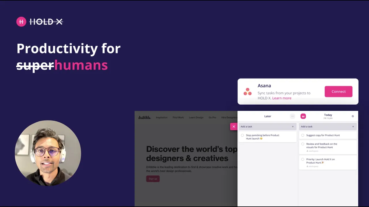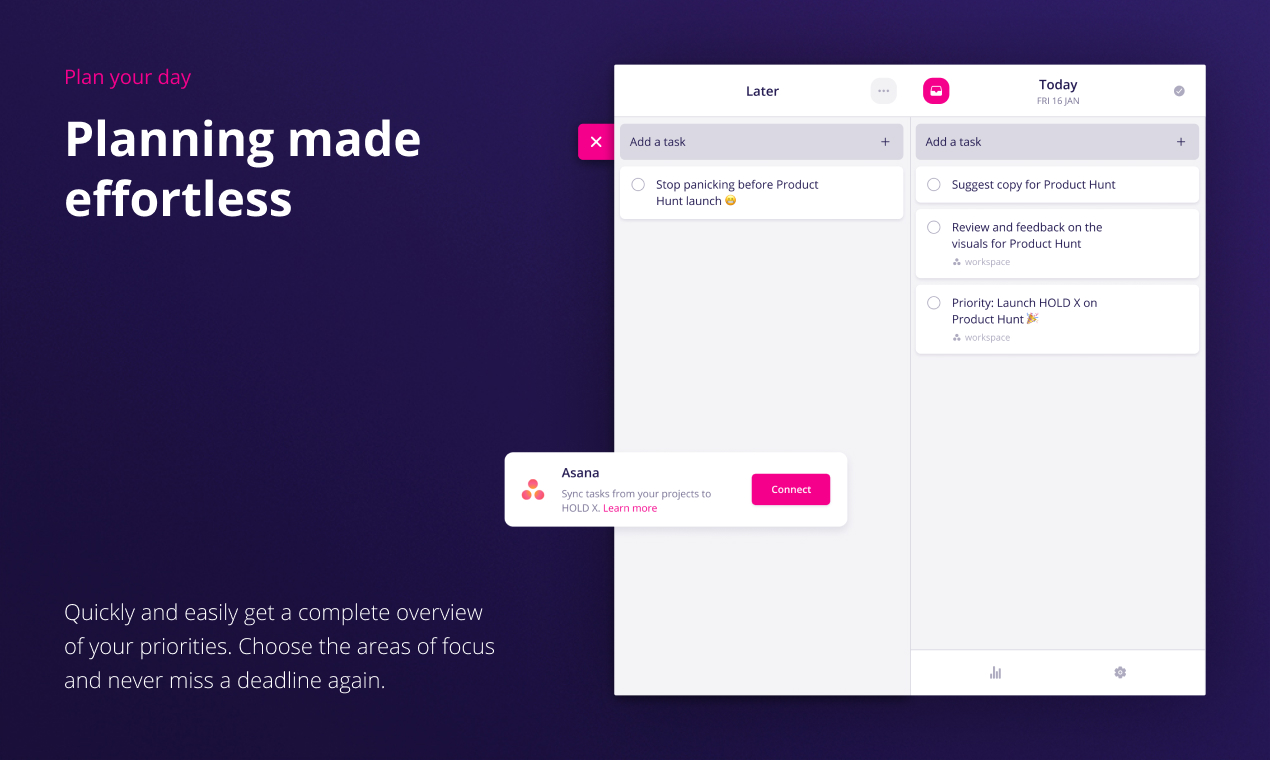 HOLD X is making productivity simple. With HOLD you can plan your day from within your browser and execute without distractions. Get started in 15 seconds, save at least an hour a day and never miss a deadline again.