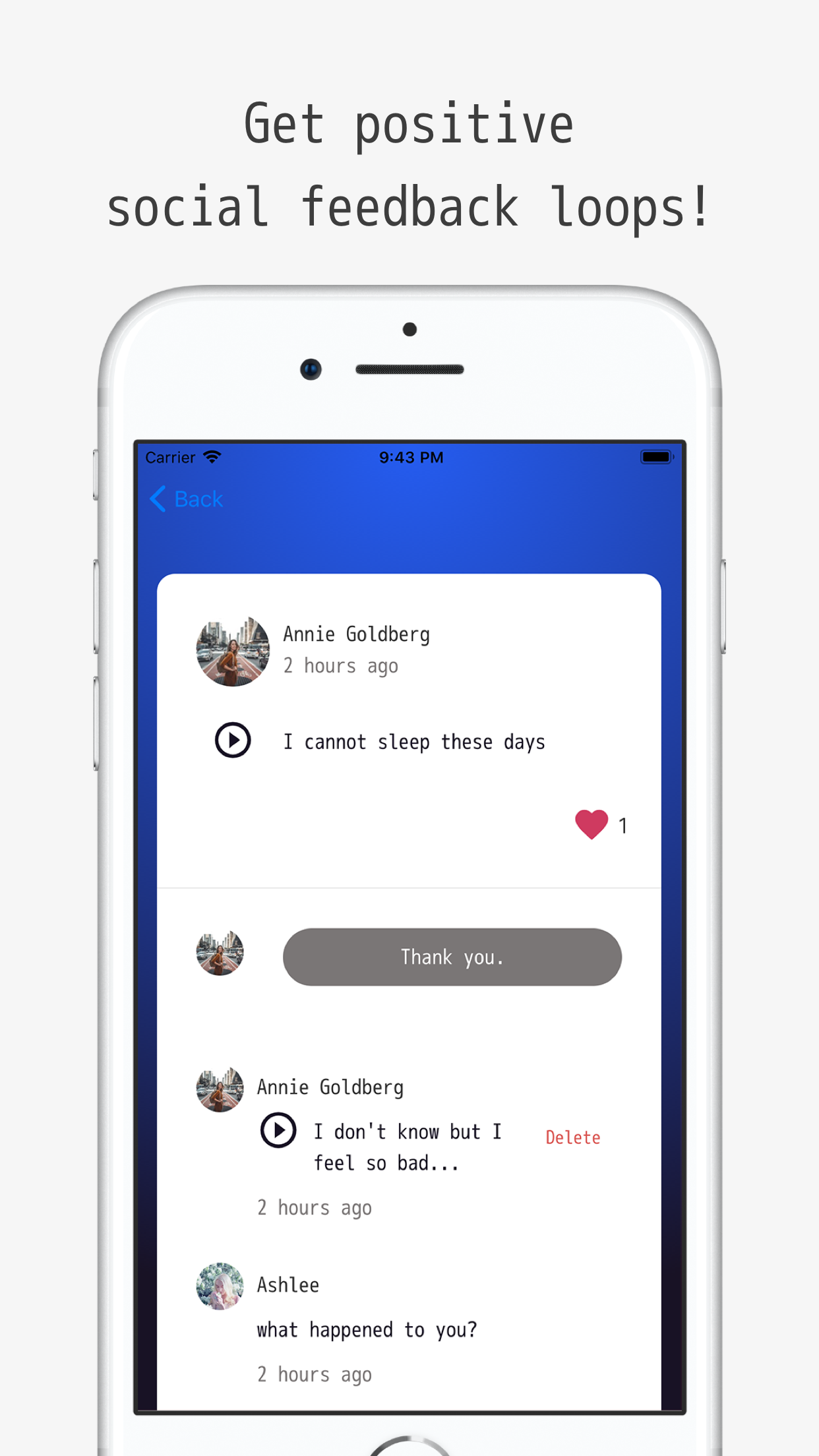 We are creating a social platform to encourage mental well-being. Obviously, our online life is rich enough. We can link to anyone, anytime, anywhere. However, can we say our hearts are happy? Actually, many of you may feel tired about permanent notifications and messages. In addition, there are some aggressive or negative sides in some of SNS in Blue. This tiredness and negativity create unhealthy reactions not only for our minds but also for our society. We need to create positive social feedback loops. That’s why we created Nao which means “Now and on”.? Nao is a voice-based social platform which can create positive social feedback loops.