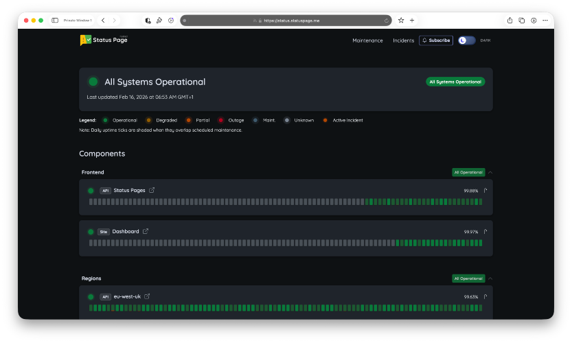 Hosted Status Page provides status pages for both individuals and companies with integrated downtime detection with notifications. More features such as SSL certificate monitoring, DNS records validator, DNSBL checker etc are scheduled to be built in the very near future. HSP is still in paid public beta, and we're looking for brave testers! We're also providing free status page for businesses and individuals who are fighting against Covid-19 or helping and/or supporting regarding the fight against Corona virus outbreak. Reach out for more info.