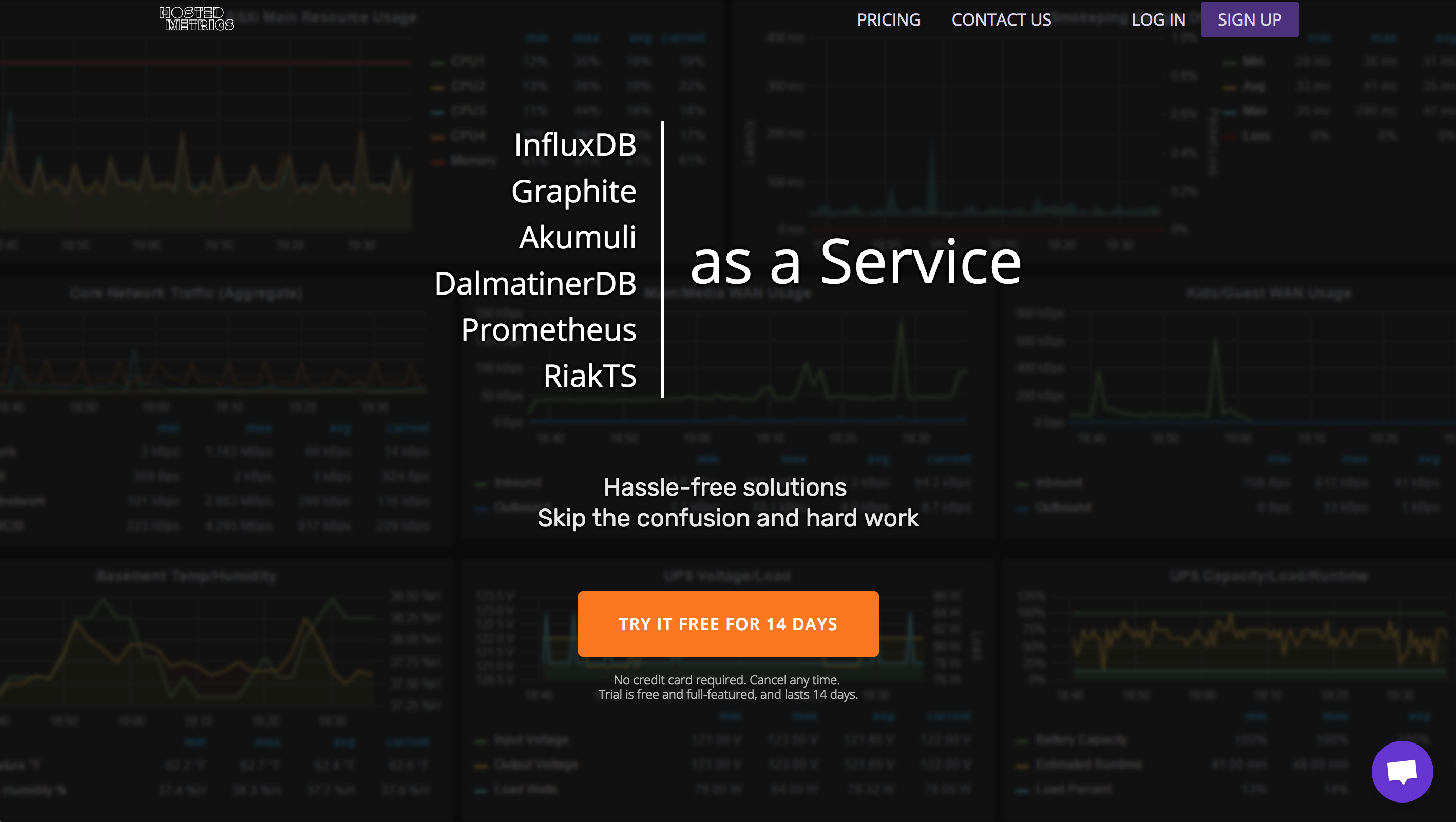 Provides metrics platforms and time-series databases as a service, hosted, managed, and sensibly pre-configured. Includes dashboards via Grafana, and alerts functionality. The first batch of supported products are InfluxDB, Graphite, Akumuli, DalmatinerDB, Prometheus, and RiakTS.