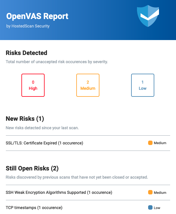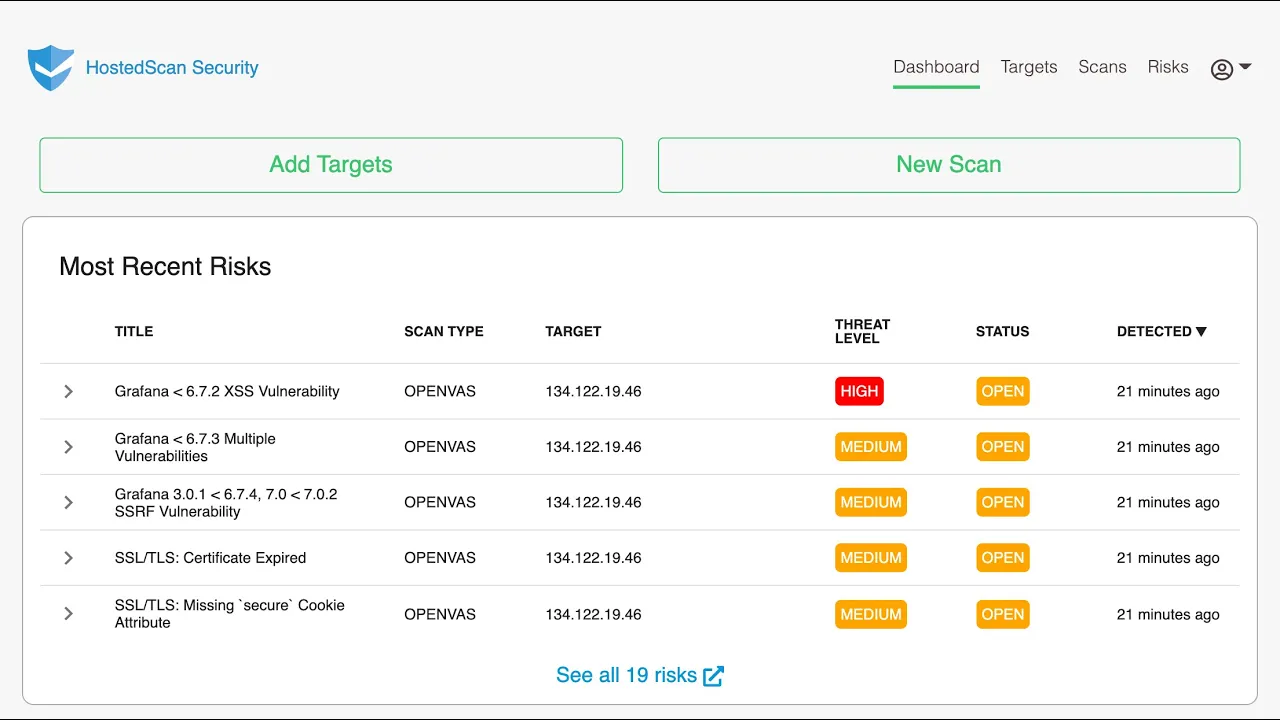 HostedScan Security makes vulnerability scanning easy for any business. Start using powerful industry trusted tools such as OpenVAS, NMAP, and OWASP ZAP to protect your website, servers, and network in minutes! Use HostedScan Security to run vulnerability scans on-demand or on a recurring schedule, get alerts for new findings, and manage findings with our vulnerability risk management solution.