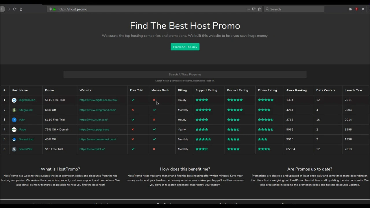 HostPromo is a website that curates the best promotion codes and discounts from the top hosting companies. We review the companies product, customer support, and promotions. We also detail as many features as possible to help you find the best host!
