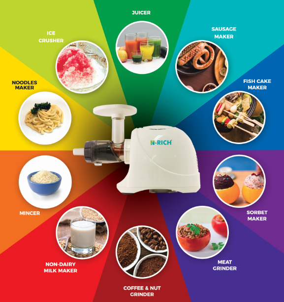 The HRICH Misso 10 in 1 Juicer is a great juicer at a great price and with superb features, versatility and providing amazing health benefits. The Medilight Misso 10 in 1 is a slow turning cold press style juicer and can extract healthy juices from carrots, celery, parsley, apple, spinach, wheatgrass, orange, kale, cucumber, ginger, sprouts, and many other leafy greens It is a great all round juicer. It’s single auger masticating process efficiently extracts the enzyme and nutrient rich juice and the gentle, slow chewing, 80 rpm auger action reduces friction and heat and ensures that the juice of of a high quality. Not just a juicer – Also good for processing whole foods and creating tasty meals, snacks, pasta, noodles, sauces, baby food, soups, dips etc. It also grinds and minces and can be used on meats and fish as well as herbs for creating your own seasonings.