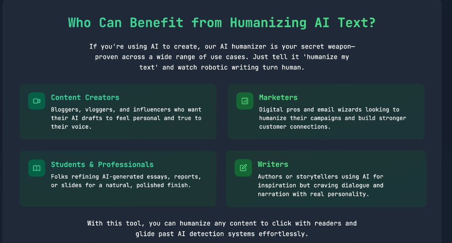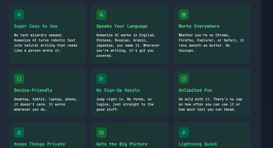 UnAIMyText is a free, online AI humanizer tool that transforms AI-generated text into natural, human sounding writing designed to engage readers and improve readability. It rephrases and refines robotic content produced by generative models—such as ChatGPT, Jasper, or other AI writing assistants—by adjusting tone, flow, and vocabulary while retaining the original meaning. The platform supports multi-language input, works across major browsers and devices and emphasizes privacy by not storing user content. In addition to enhancing readability, UnAIMyText aims to help text bypass popular AI-detection systems (like GPTZero, Turnitin, and Copyleaks) by removing technical markers and restructuring sentences to feel more human. Its simple copy-and-paste interface requires no registration, making it accessible for students, content creators, marketers, and professionals who need to quickly humanize AI-generated content for blogs, emails, reports, or social media