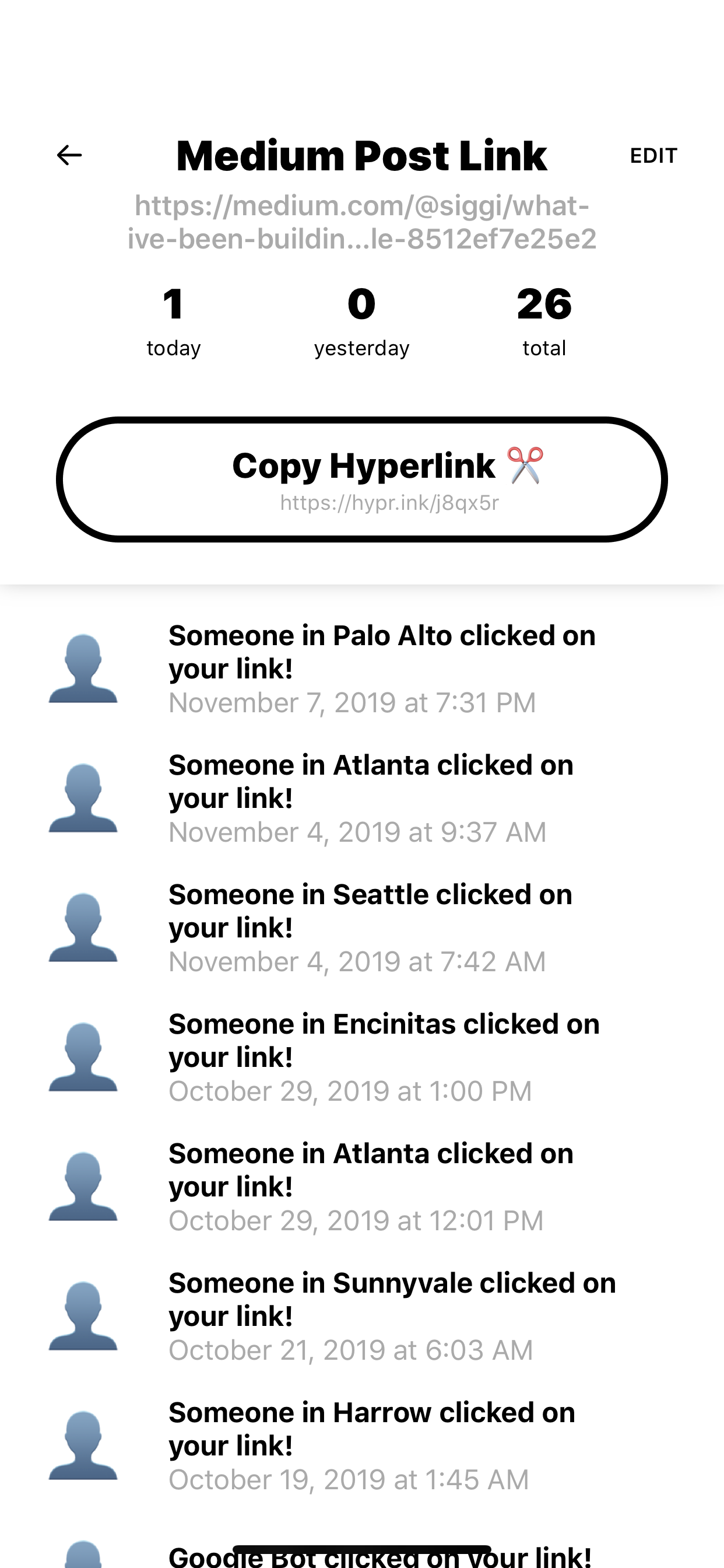 Get push notifications when your links are clicked! Hyperlink is the easiest way to find out if your links are getting clicked on. Use it to find out if your friends are clicking on the Youtube videos you send them, or if the links you're tweeting out are getting any hits!