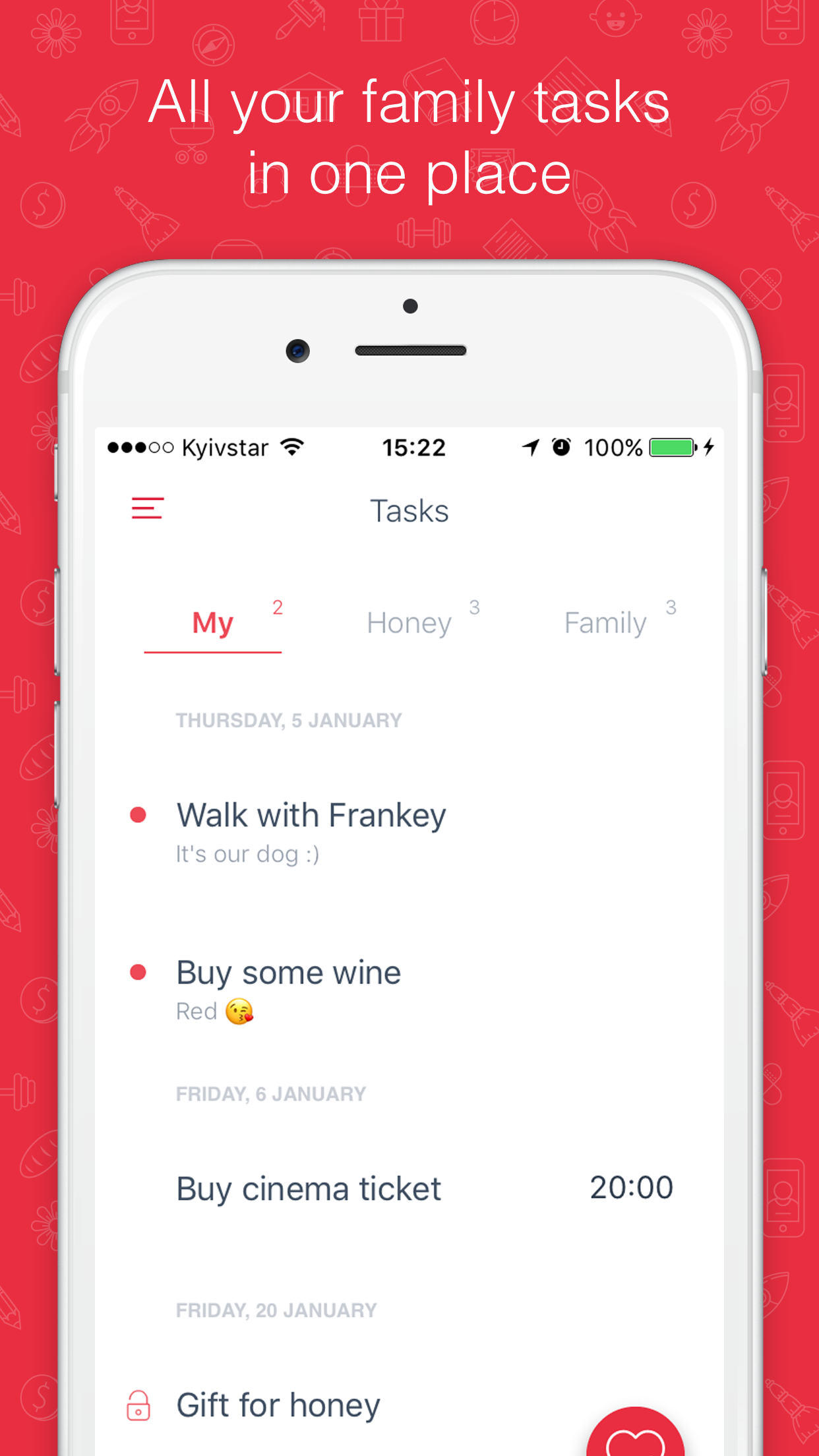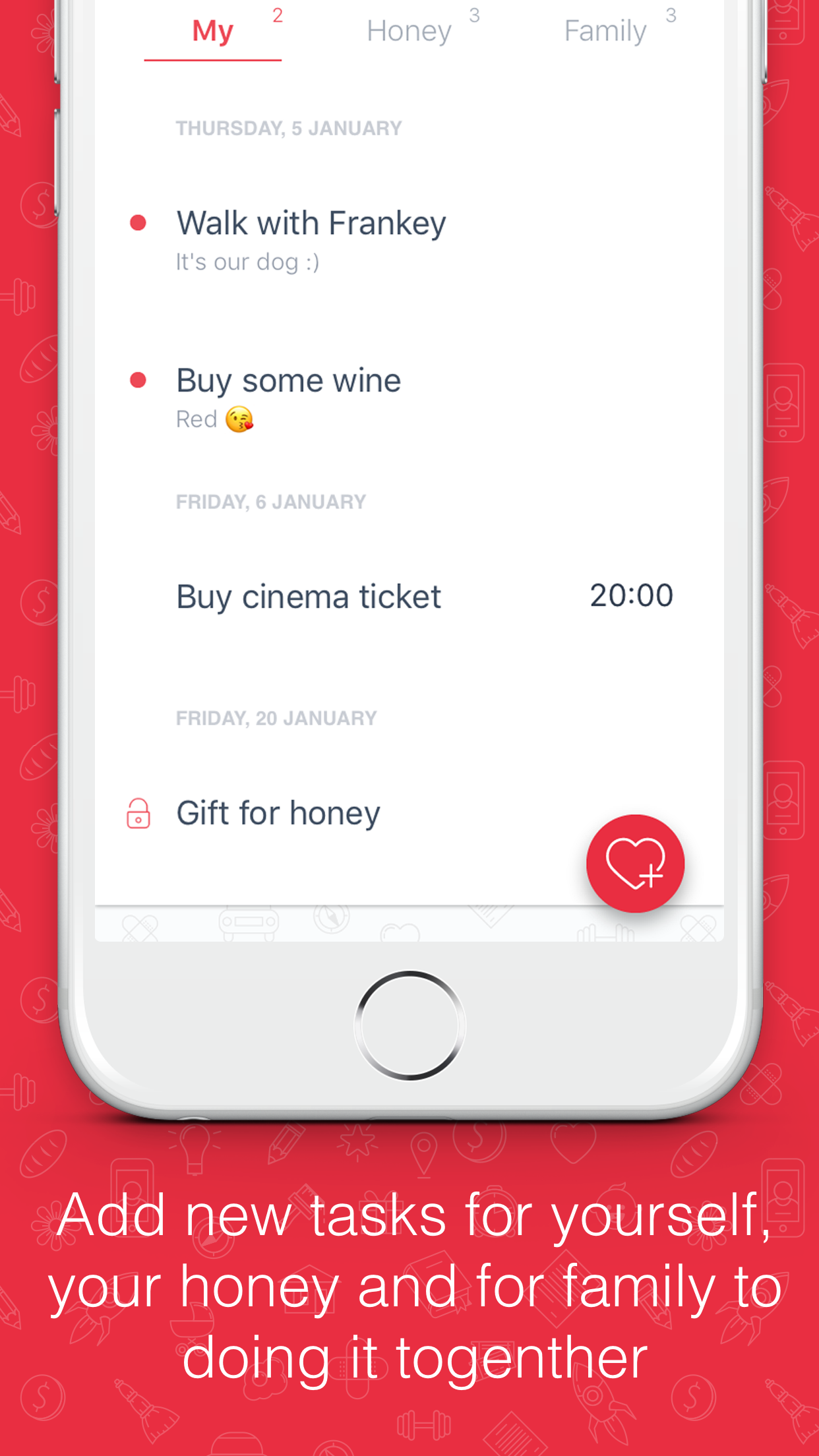 Honey is the family organizer app for you and your honey. How many times during the days you can say “Honey, I told you!”. Or just imagine to hear it :) We have a lot of input information in our daily life and it is easy to miss or forget something. And least what we want to forget are request from our honeys. Because ... we love them. It’s ok to forget something like “Could you buy a milk?” or “Could you go for a walk with our dog?“ but now you have a special place for this day-to-day family task. And you can spend more time with each other, not with a daily home stuff.