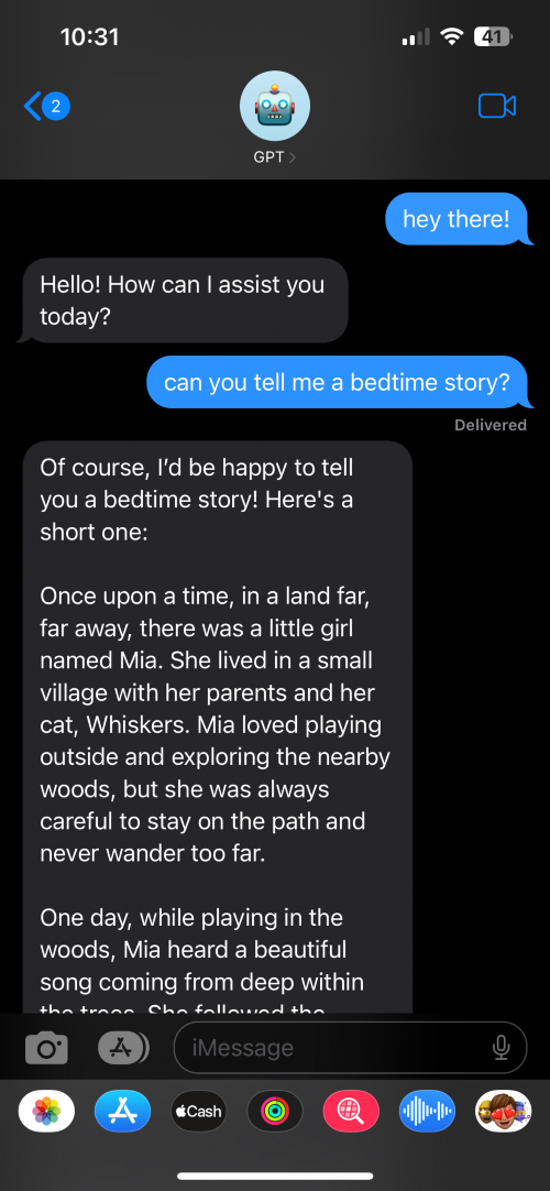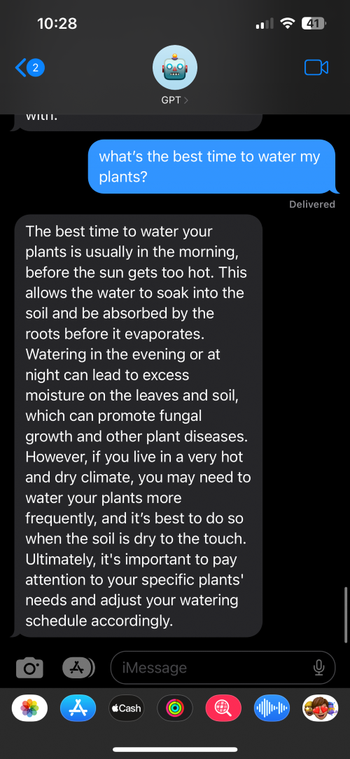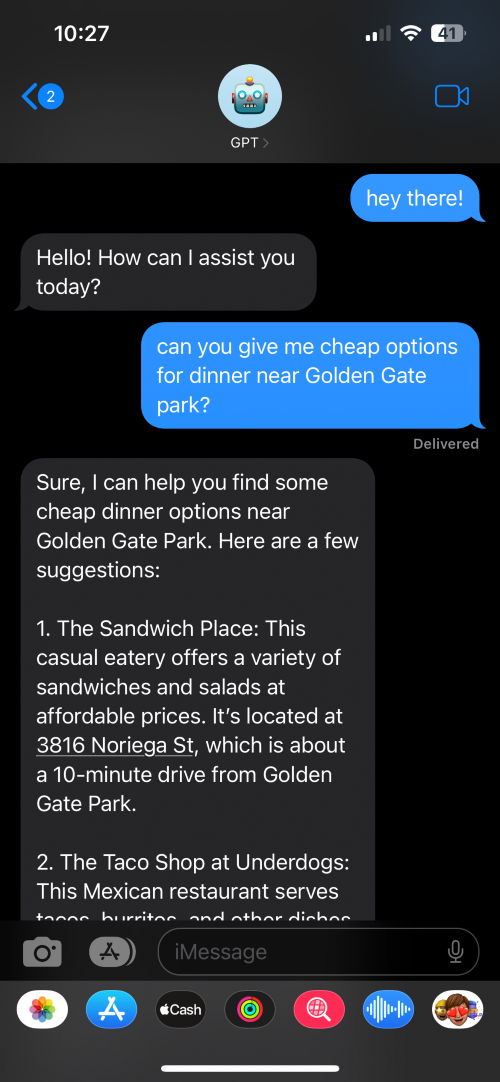 Your favorite AI assistant is now just an iMessage away. Use ChatGPT on the go from your iPhone or Watch and via Siri. Answer questions, plan travel, get recipes, or vent seamlessly in iMessage.
