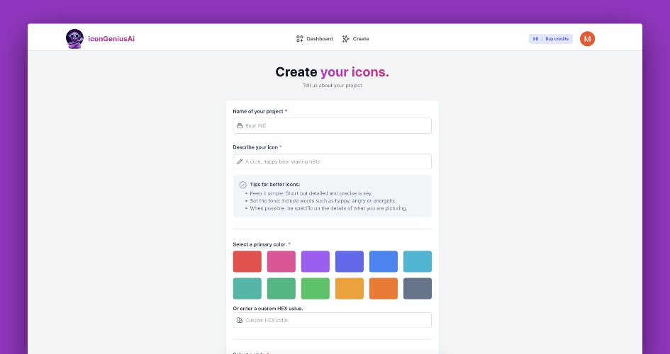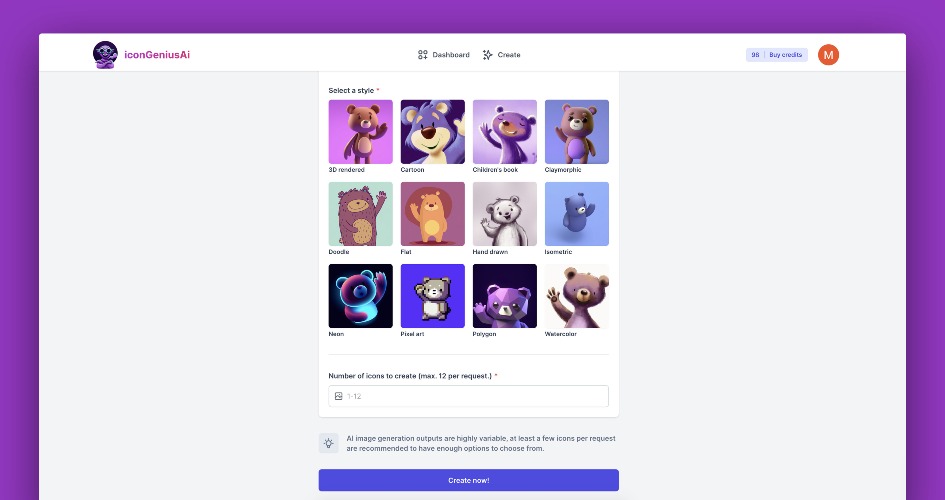 iconGeniusAi is an icon creator powered by generative AI that allows you to build the icon you need for your business, app, prints or logo, based on user input such as style, colors and description.
