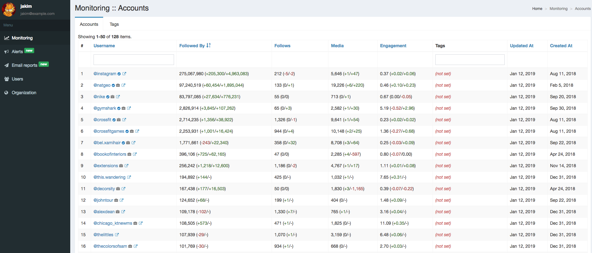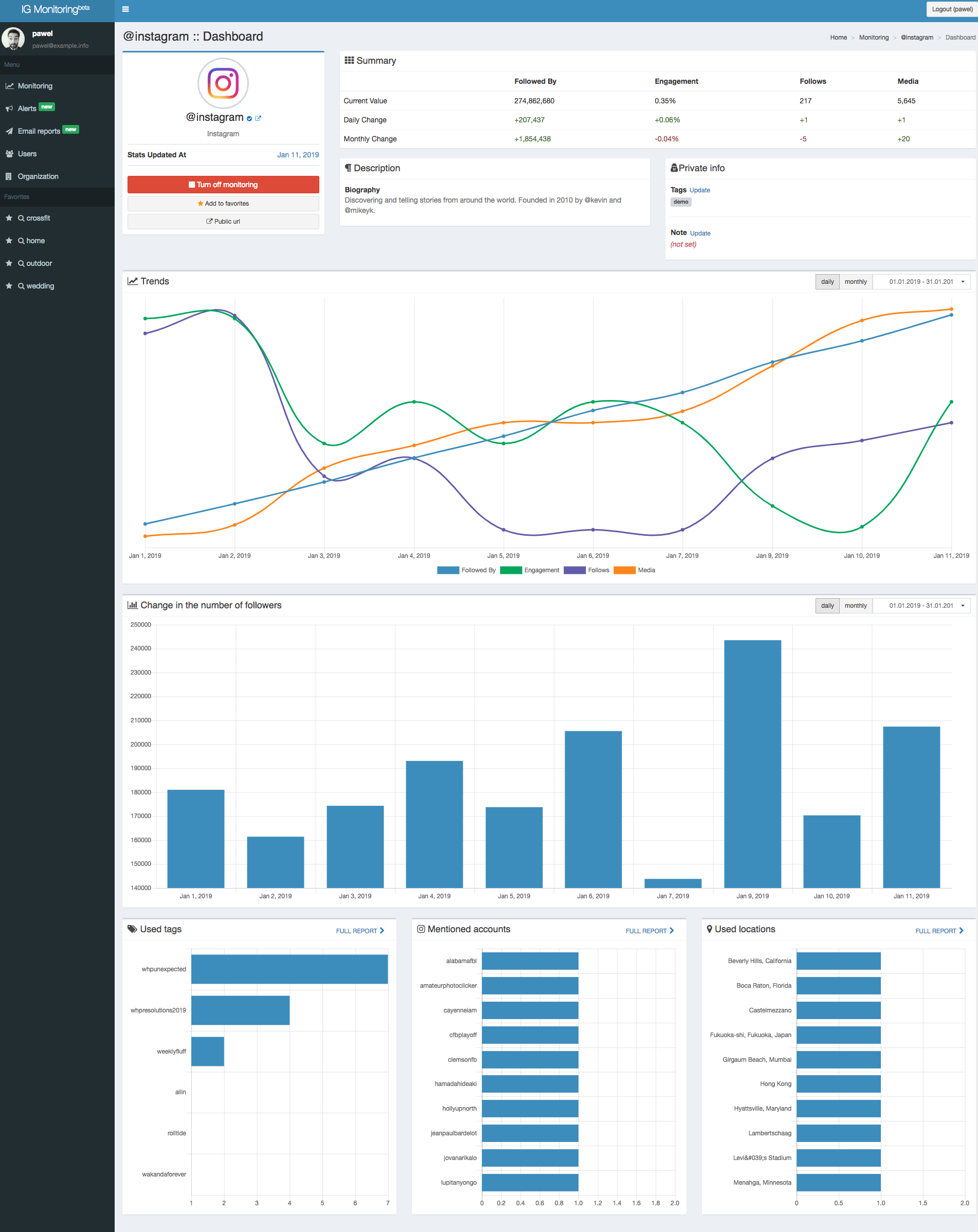 An automated system that monitors growth, sends reports and alerts you the way you want. >>> Features for managing accounts - All basic metrics (+ engagement rate) along with daily and monthly change. - Business and personal accounts. - Multiple accounts comparison. - Accounts mentioned. - Tags used. - Locations used. - Public url to account statistics view. - User accounts with limited access. >>> Find sources of new followers Thanks to tag monitoring, you'll find the best accounts in the niche, popular locations, and even related tags. By observing influancers, you will discover accounts mentioned in the posts and brands they cooperate with.