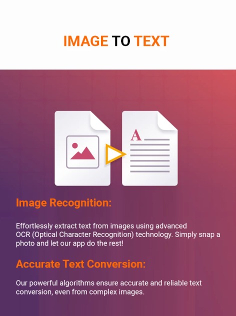 Image Recognition: Effortlessly extract text from images using advanced OCR (Optical Character Recognition) technology. Simply snap a photo and let our app do the rest! Accurate Text Conversion: Our powerful algorithms ensure accurate and reliable text conversion, even from complex images. Easily scan any documents. Text to Speech: Convert extracted text to speech with just a tap! Listen to your text messages, articles, and more, hands-free. Easy Sharing: Share your converted text via email, SMS, or social media platforms with ease.