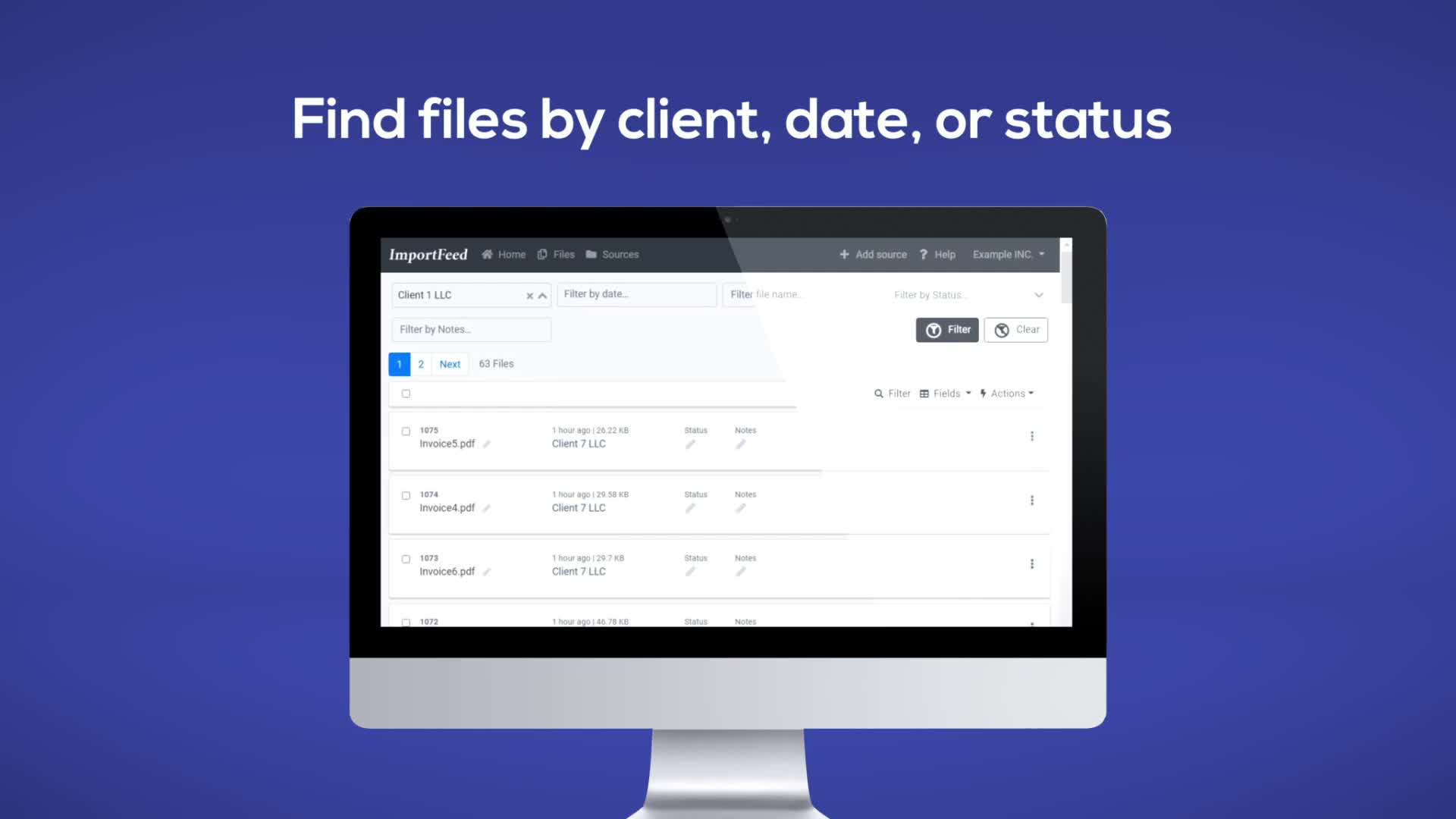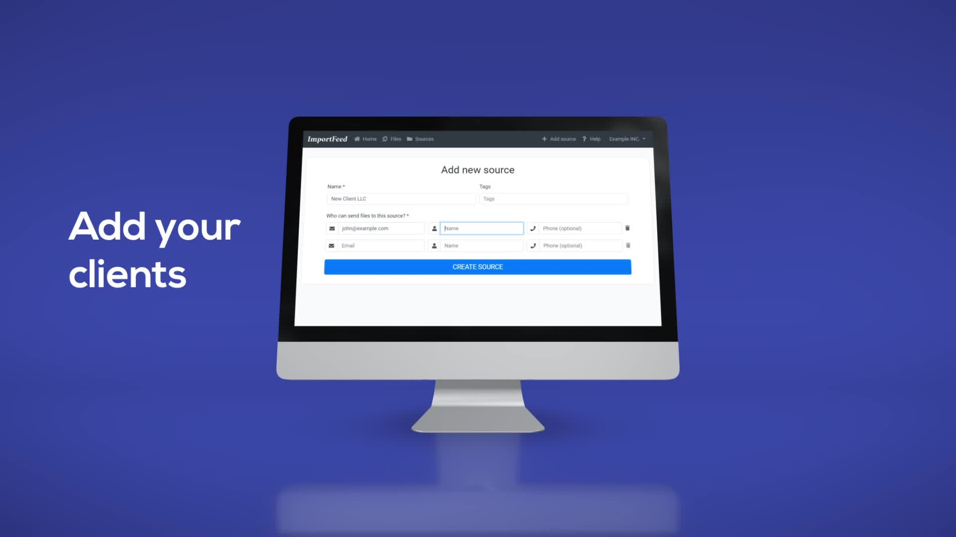 ImportFeed is a A Secure and Scalable Way to Receive Files for Businesses. • Quick to setup Invite your clients or partners using only their email. • Easy for clients Clients can securely send files at any time. No need to install anything. • Powerful for teams All your team's files in one place, searchable and ready.