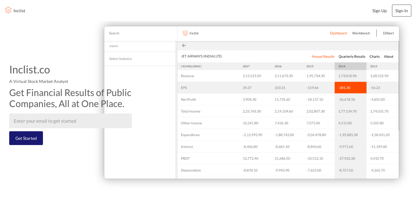 Hey Betapage, Inclist is a tool for investors to view financial results of public companies, all at one place. here's a link to the website - https://inclist.co Why i wanted to build this thing? Whenever I have some extra money, instead of keeping them in bank, I like to invest it in stocks. Usually I download their annual reports of past 5 years and then use excel sheets to analyse the annual and quarterly results. But like most people, I am not a full time investor. I spend most of my time coding and making things. So i wanted to build a market analyst, which would collect all the financial data of companies, and make it easier for investors to select and filter out the good companies. And that's what inclist does. Here you can view all the annual results, quarterly results and balance sheet of public companies. I hope you will find it useful :)