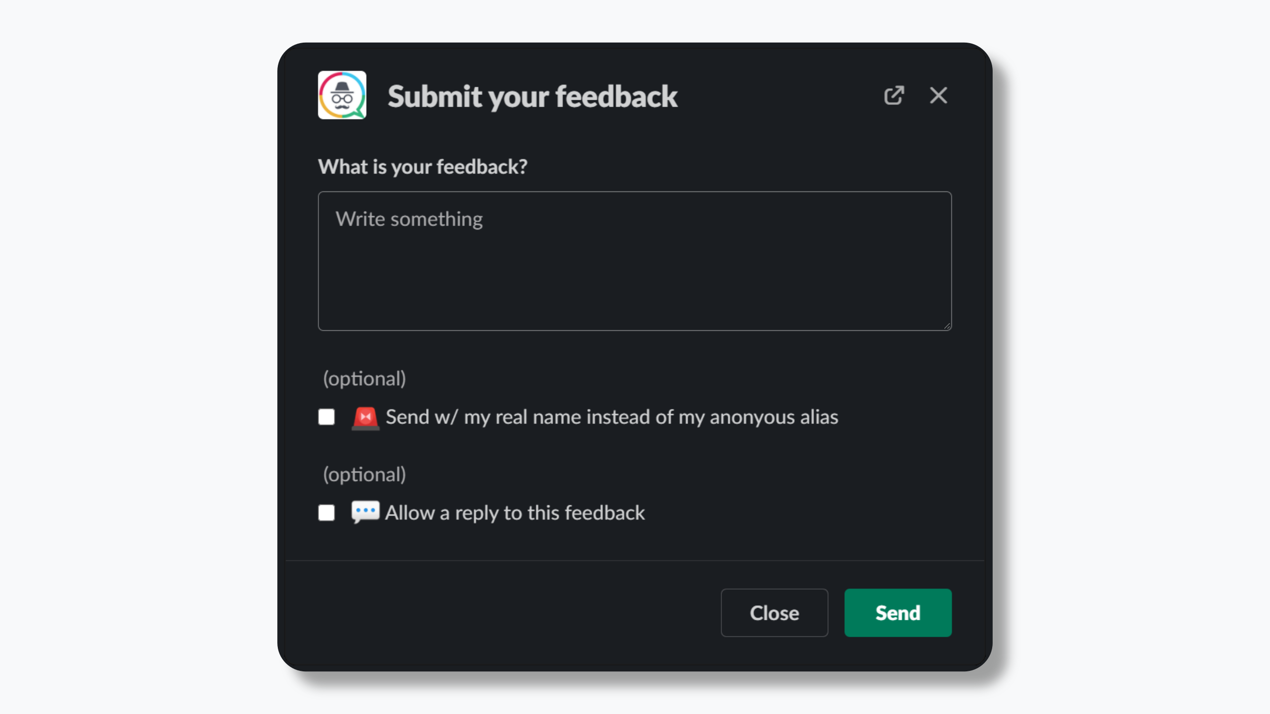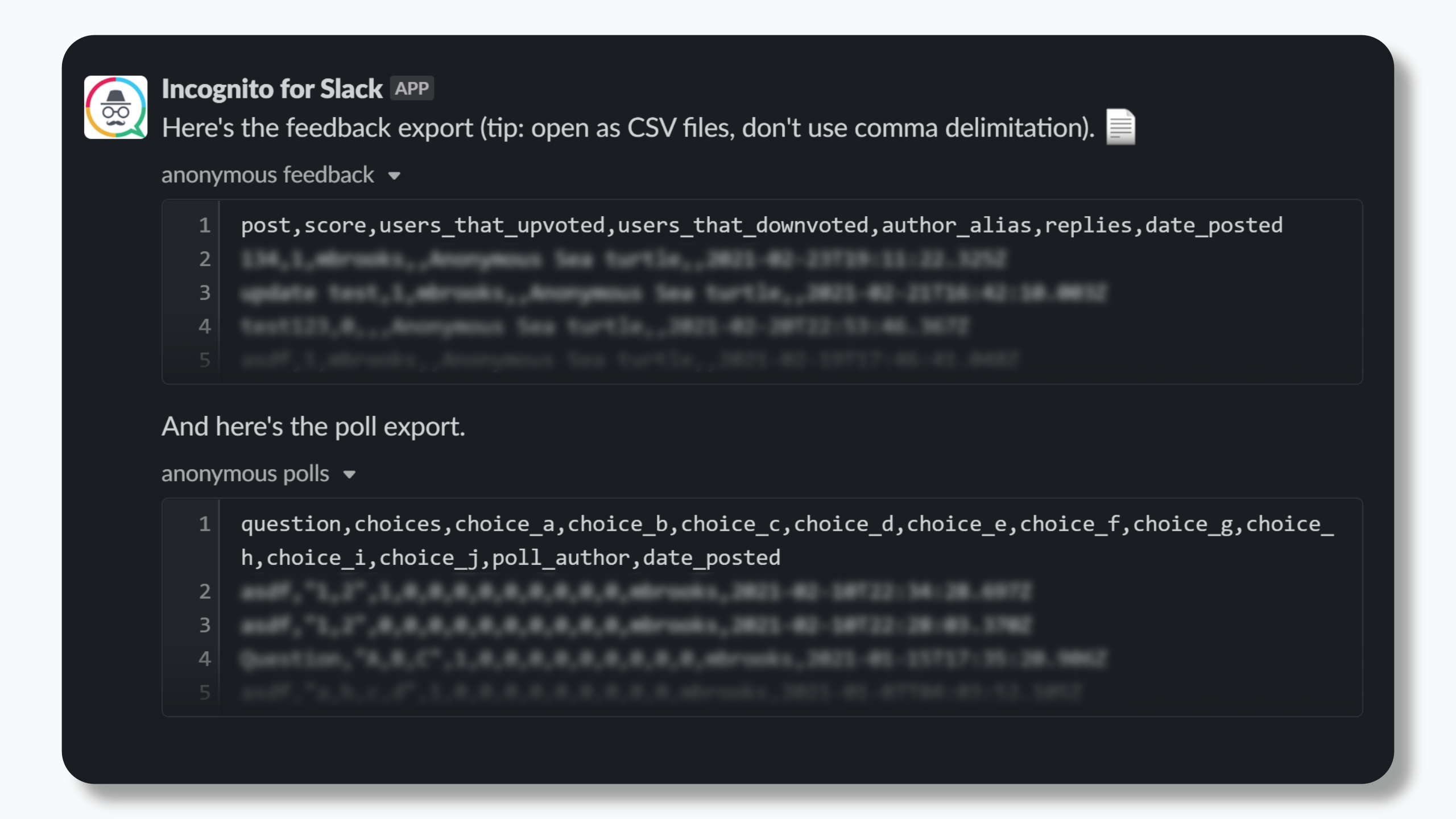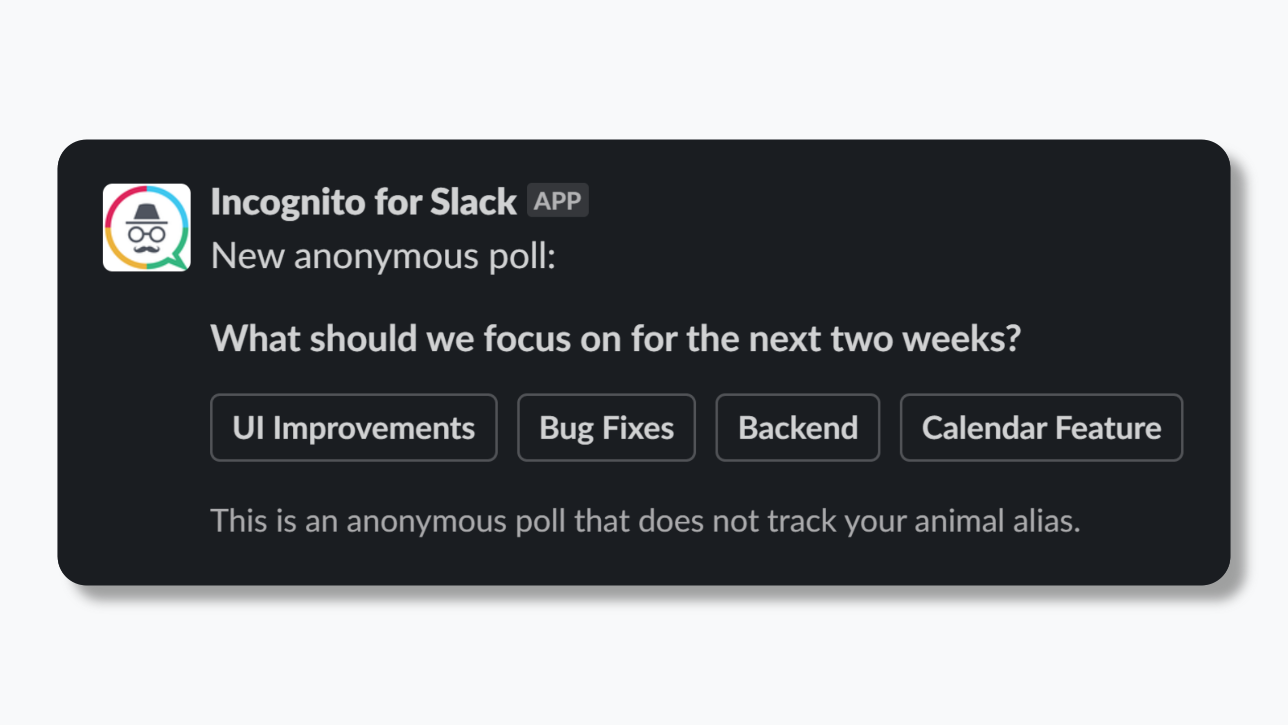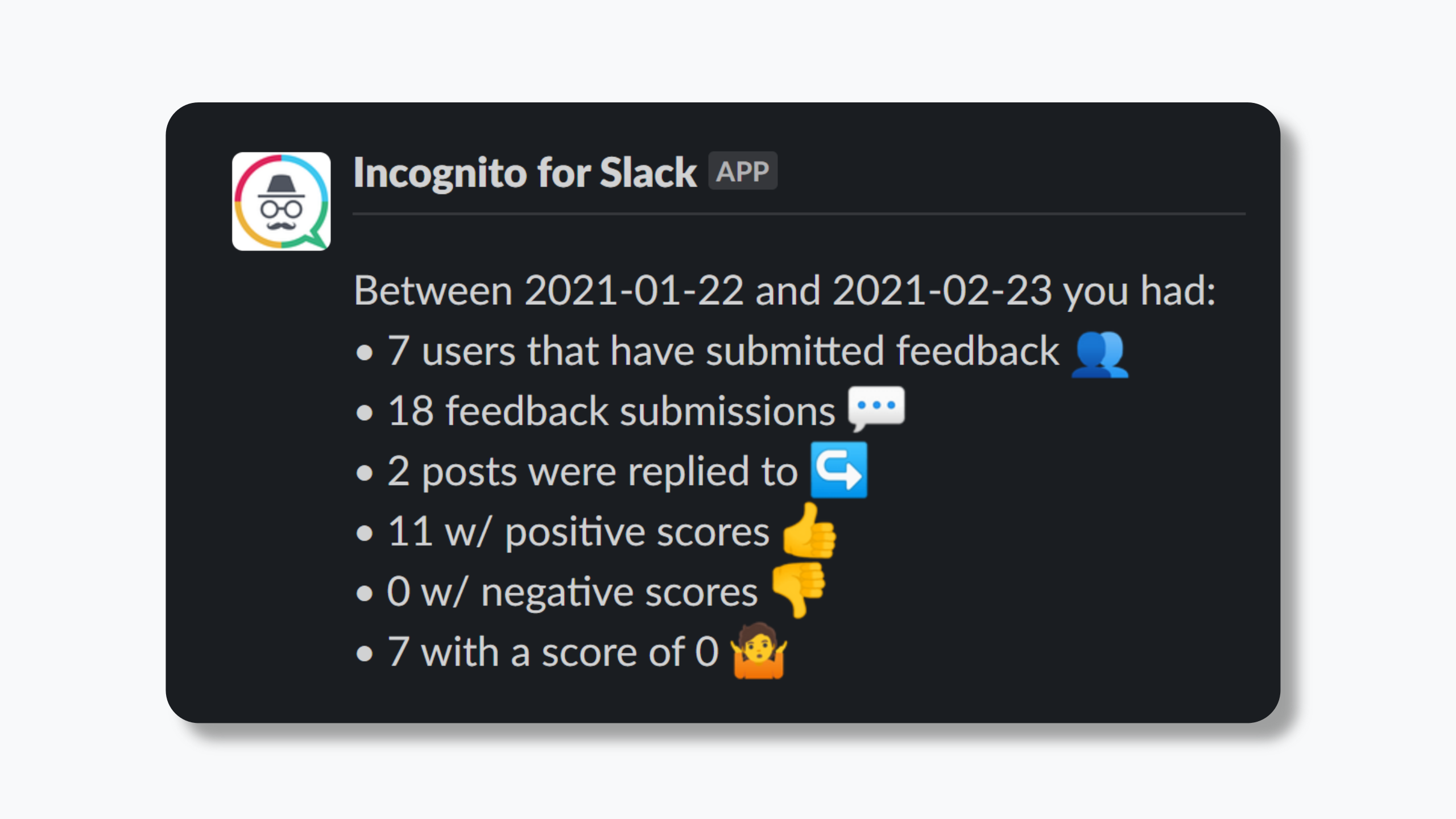 Get anonymous team feedback in a private slack channel. Every user gets an anonymous animal alias so you can differentiate between users without knowing who they are! We help you: - Encourage open and honest feedback - Empower your team by valuing their input - Spotlight common issues quickly - Help passive employees have their voices heard - Level the playing field for all team members - Reward the most helpful feedback Slash Commands /incognito Your team can use this command anywhere in Slack to anonymously submit feedback into your private leadership channel. /incognito-poll (Admin channel only) Create an anonymous poll for your #general channel. /incognito-stats (Admin channel only) Displays the total users, feedback submissions, including how many were ranked helpful, unhelpful, and neutral. /incognito-export (Admin channel only) Export all feedback and poll data into a CSV file into slack (excluding real names, of course) /incognito-champion (Admin channel only) Send a DM to the user that submitted the most helpful feedback. Give them a thanks, or a reward!