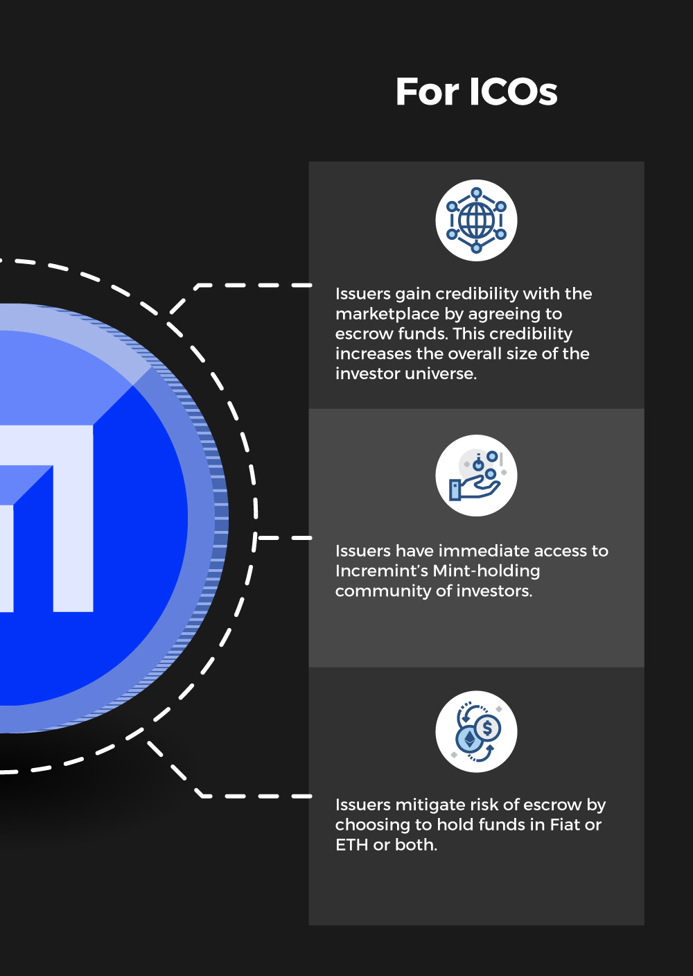 Incremint is selling Mint tokens in its own ICO. Mints will entitle their bearers to a 10% discount on token purchases in ICOs being conducted using Incremint platform. Mints function as a discount voucher in token purchases – they are not tendered as payment themselves. As such, Mints have unlimited life and can be reused in subsequent ICOs. Each Mint token has a basis value of 0.01 ETH – such to control proportionality in their usage. One Mint token entitles its bearer to a 10% discount on an ICO purchase up to .01 ETH. Incremint is issuing Mints for the purpose of creating an enhanced ecosystem of demand to increase the success of issuers ICOs. Proceeds will be spent on platform development. Mints are being sold at a fraction of their basis value to incentivize robust adoption of their usage in the ICO market. Pricing affords bearers a lucrative IRR on Mint token usage.
