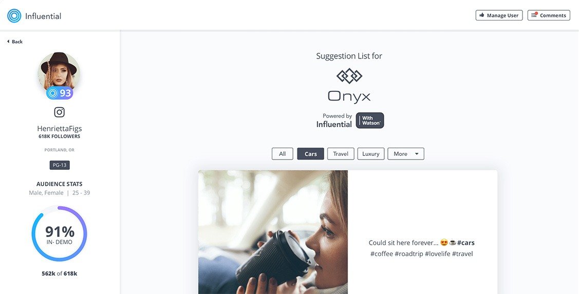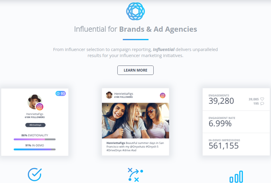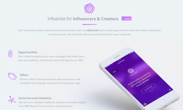 Influential is an AI social data and activation technology. We match brands to audiences all through transparent data and machine learning on Facebook, Instagram, Twitter, Snapchat and YouTube based on deep data enriched by IBM Watson. The results are magical. The most challenging component to a successful campaign is selecting the right influencers. Influential eliminates that pain point by leveraging AI and machine learning to suggest influencers through actionable insights and predictive intelligence. From influencer selection to campaign reporting, Influential delivers unparalleled results for your influencer marketing initiatives.