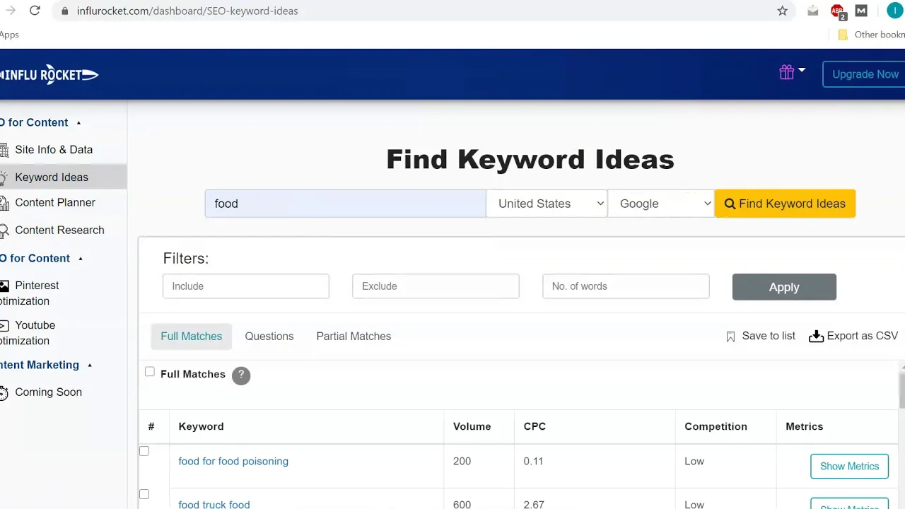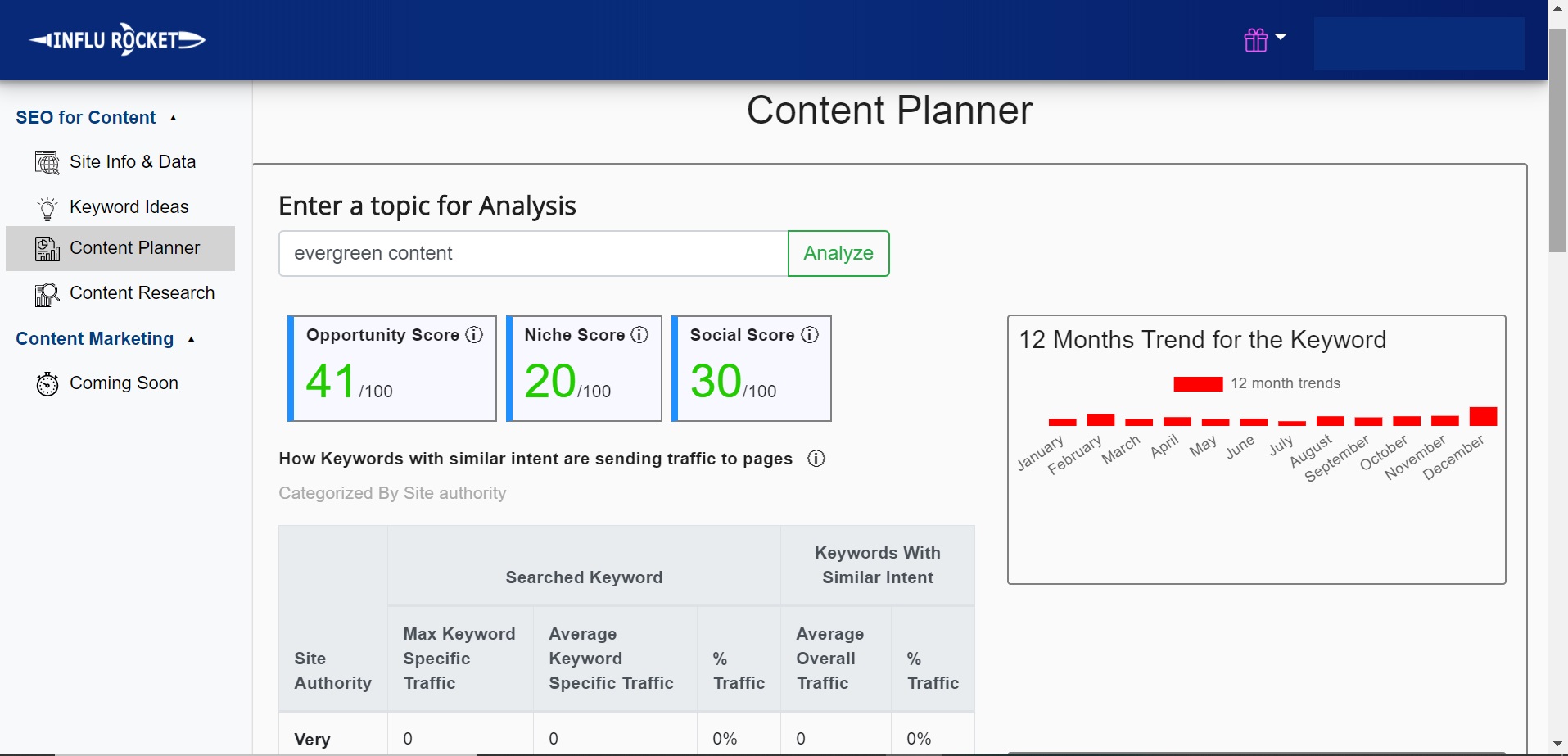 InfluRocket is a combination of many tools. Keyword ideas tool helps you generate great keyword ideas by fetching data from multiple different platforms. Content Planner and Content Research tools help you find out competing contents, content opportunities and questions people are asking about the topic.