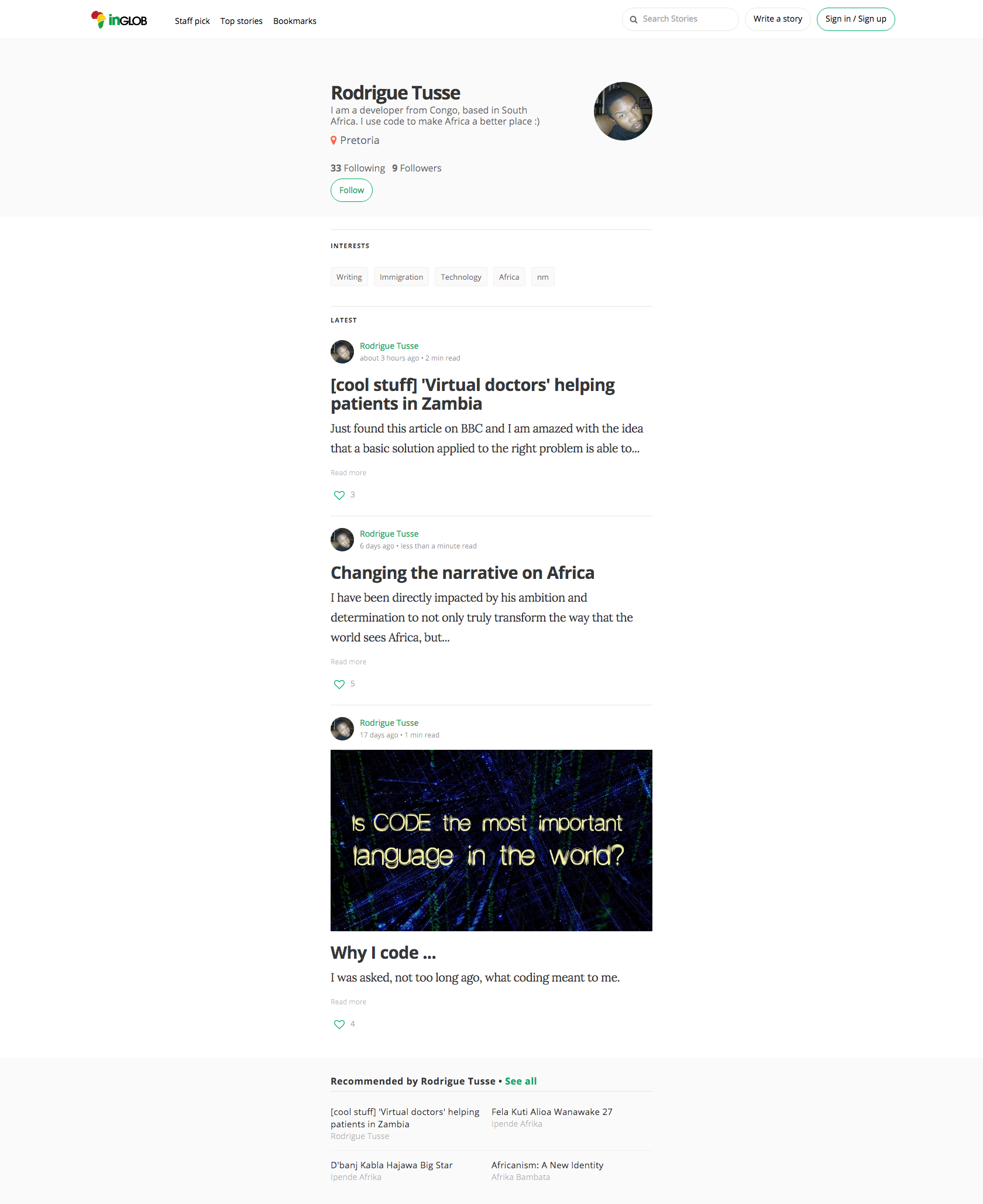INGLOB is a open publishing platform for African writers and bloggers. It was founded in Pretoria, South Africa by Rodrigue Tusse with the goal to promote African stories and ideas.