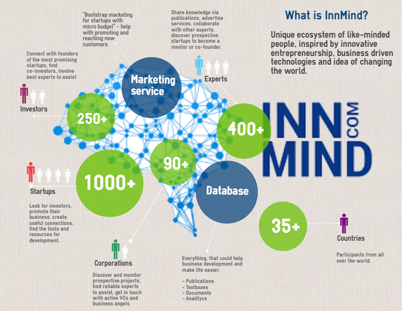 InnMind is a global ecosystem for all participants of innovation community: providers and suppliers of innovative technologies, start-up founders, experts, mentors and service providers who are focused on work with startups and/or investors support organizations InnMind provides efficient multifunctional instrument to help them to be more productive and successful. InnMind is a 3-in-1 platform combining: outstanding online database (marketplace) of innovative technologies, R&D projects and high-tech startups, web network portal that connects professionals in the sphere of innovations support for innovative projects in starting a business, fundraising, entering the market and expanding (useful materials, experts opinions, analytical reports, marketing services, webinars, legal services, etc)