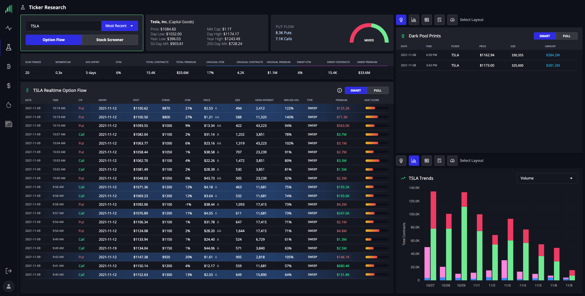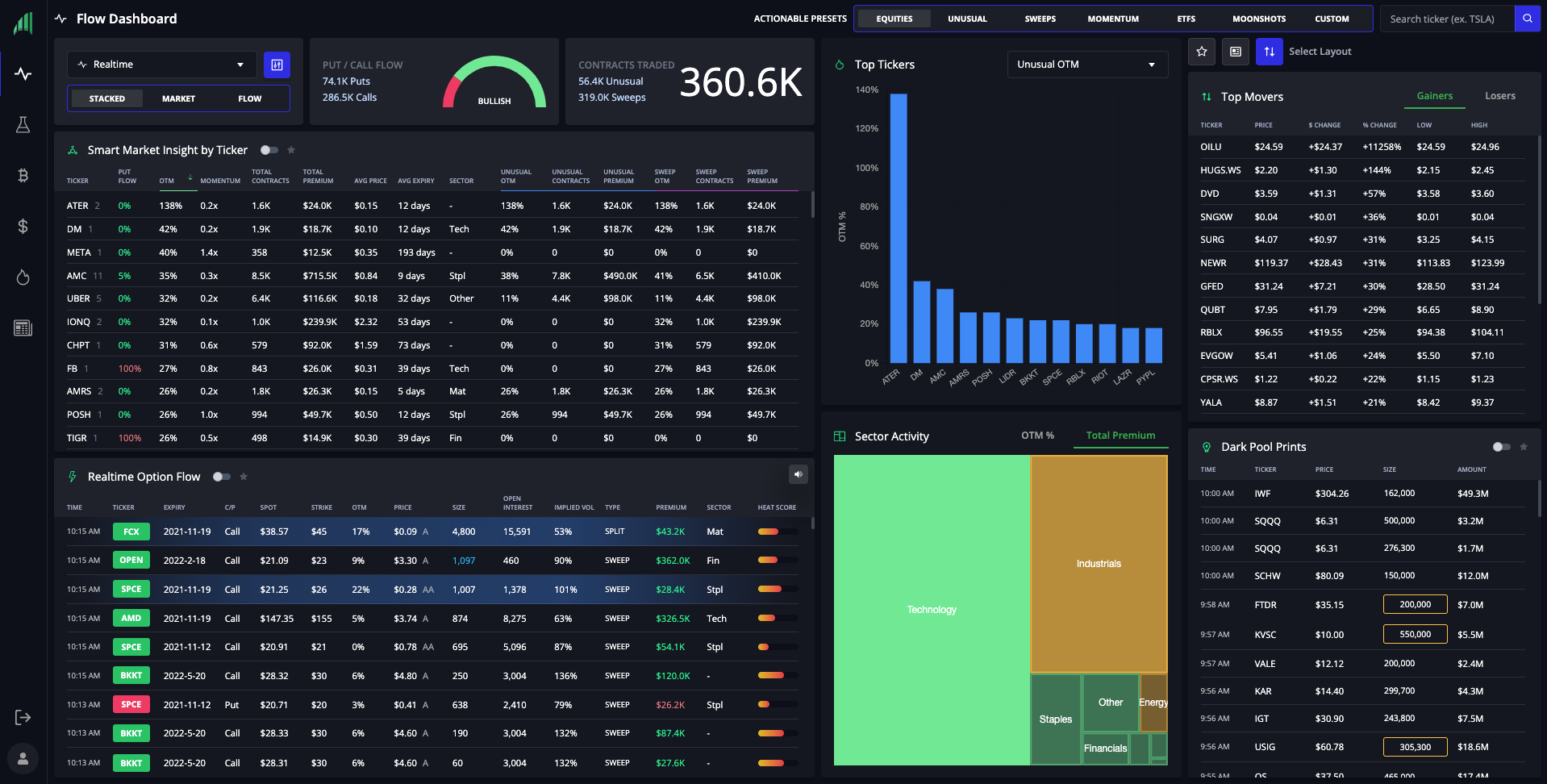 As a thank you for taking the time to learn about us, we'd like to offer a special discount for those who finish reading our page. Our mission is to educate the average investor and give traders of any experience level the data, tools, community, and education to profit from trading stocks, options, cryptocurrencies, and forex, empowering them to earn life-changing income from the financial markets. Our data-driven tool kit includes: - Option Flow + Dark Pool Dashboard - Automated Technical Analysis System - Algorithmic Trade Ideas + Breakout Signals - Stocks, Crypto, & Forex News Sentiment + Market Scanner - Industry Leading Ticker Analysis with Actionable Charts & Data What Problem Do We Solve? The world of trading has changed considerably. Many years ago, the real challenge in retail trading was accessing information. However, as data becomes more widely available every day, access to data is no longer exclusive to big institutions. The problem right now is that traders are drowning in a sea of information and need tools to analyze and interpret complex data to make better trading decisions in less time. Data without context is not helpful. In today’s landscape, a successful trader needs high-quality, processed data and the tools to generate trade ideas and research high-potential trades. Because institutional traders control the market, understanding and interpreting institutional flows is critical to help traders increase their chances of success within the current market context. High potential trade ideas have a much higher chance of success when supported by strong technical analysis. Because sophisticated technical indicators are complex to understand and challenging to implement, traders need fast and accurate technical analysis software to identify optimal entries/exits and trade confidently. How Do We Solve The Problem? For years, traders have been demanding better software because they saw that they could increase their probability of success if they had the right tools. There are several tools that can help traders identify institutional flows. However, the best tools don’t just show where institutions are positioned — they also help traders determine which trades have the most potential within the current market context. InsiderFinance is the top platform offering traders clarity when it comes to big data and technical analysis. Our proprietary algorithm analyzes institutional options order flow and dark pool prints to provide actionable market intelligence that helps traders identify upcoming market movements and figure out patterns that can turn into profitable trades. Our proprietary, fully automated technical analysis system takes the guesswork out of finding winning chart setups to help traders identify optimal entry and exits points to maximize returns on every trade. Coupled with extensive education and a supportive trading community, InsiderFinance offers a complete trading system. The InsiderFinance trading system makes big data and complex technical analysis easy to understand and simple to use, resulting in highly successful trades for any asset class and satisfied traders of any skill level. How Are We Disruptive? At InsiderFinance, we challenge the status quo. That’s why when we saw other options flow platforms only show glorified data tables and very minimal market context, we knew we had to completely reinvent this powerful tool to empower retail traders. Our guiding principles are simple: better data leads to better trading returns, and powerful visualizations support faster trade decisions. The intelligently processed data, proprietary indicators, and advanced tools offered by InsiderFinance are more powerful and easy to use than other order flow platforms currently available. Several differentiators help InsiderFinance stand out from the crowd: - Intelligent order processing and tracking - Powerful and varied signal categories - One-click setups and filtering - Custom watchlist - Advanced filtering - News sentimental analysis - Advanced analysis and market context - Powerful visualizations and integrated charts - Mobile-friendly snapshots InsiderFinance offers robust tools so traders can easily identify high-conviction trades with news sentiment, proprietary indicators, and trends analysis on the platform. The platform also features advanced visualizations that go beyond the essentials to help traders quickly find market and sector trends. But we didn’t stop there. To truly level the playing field with institutional investors, traders also need institutional-grade technical analysis that’s simple and intuitive to find winning chart setups and optimal trade entries/exits to maximize returns on every trade. Combined with comprehensive education and a supportive trading community, this powerful toolkit makes InsiderFinance the best platform to bridge the information gap between retail traders and institutional investors. Compared to other alternatives, only InsiderFinance offers high functionality in every area. Sign up today with code BETAPAGE20 to receive 20% off your first payment, even on an annual subscription!