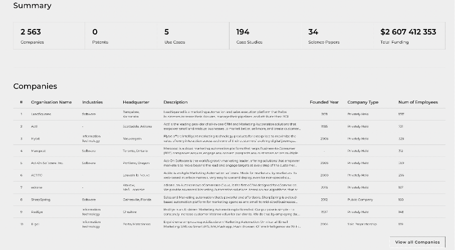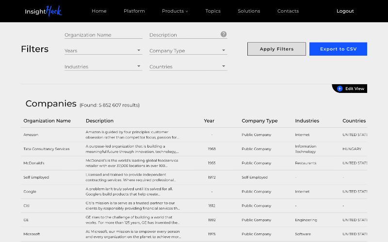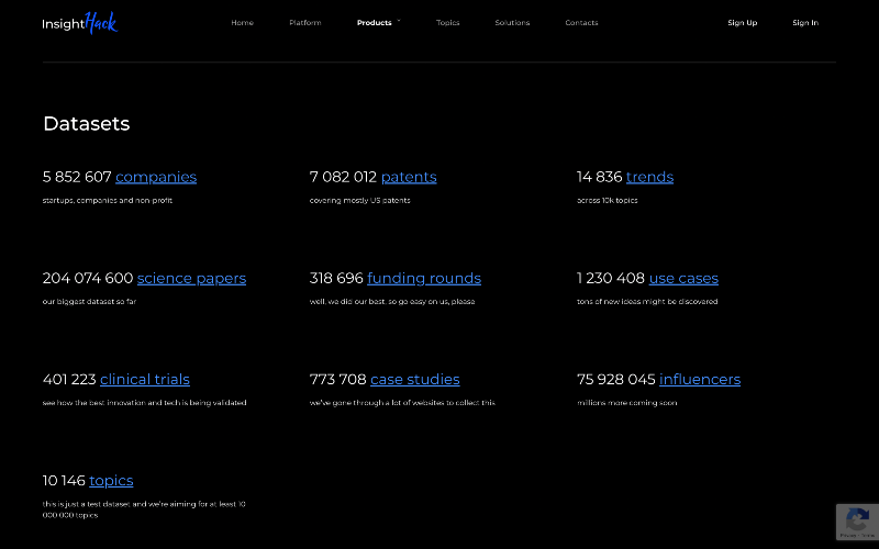 InsightHack is a set of tools for market research and competitor analysis. It allows unlimited data exploration with regards to companies, funding, patents and science papers, clinical trials and trends, use cases and case studies, influencers and opinion leaders. Moreover, it's totally free of charge. InsightHack can be used for technology exploration and scouting, ideas validation and research, discovering new products and many more Just few numbers: - 5 852 607 companies - 7 082 012 patents - 14 836 trends - 204 074 600 science papers - 318 696 funding rounds - 1 230 408 use cases - 401 223 clinical trials - 773 708 case studies - 75 928 045 influencers