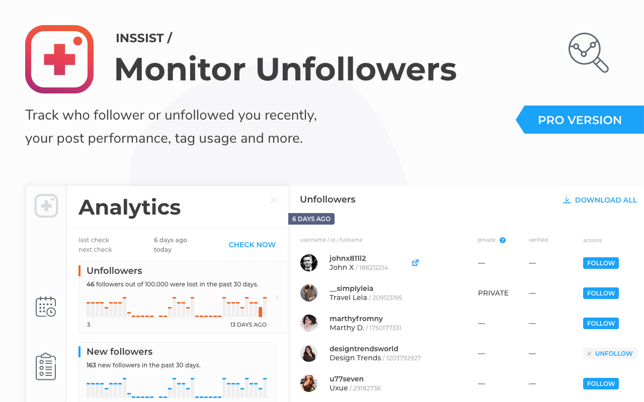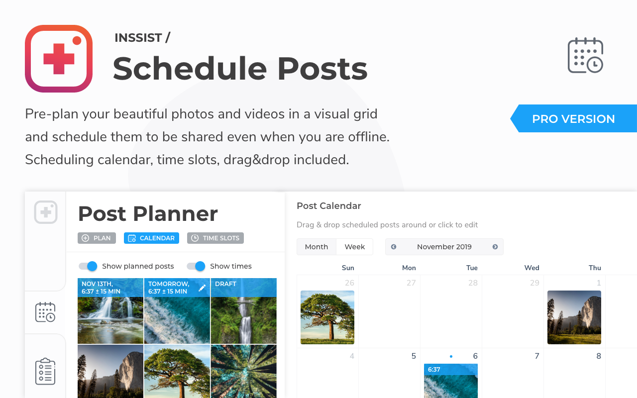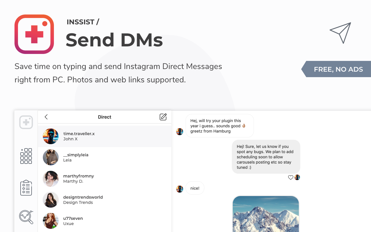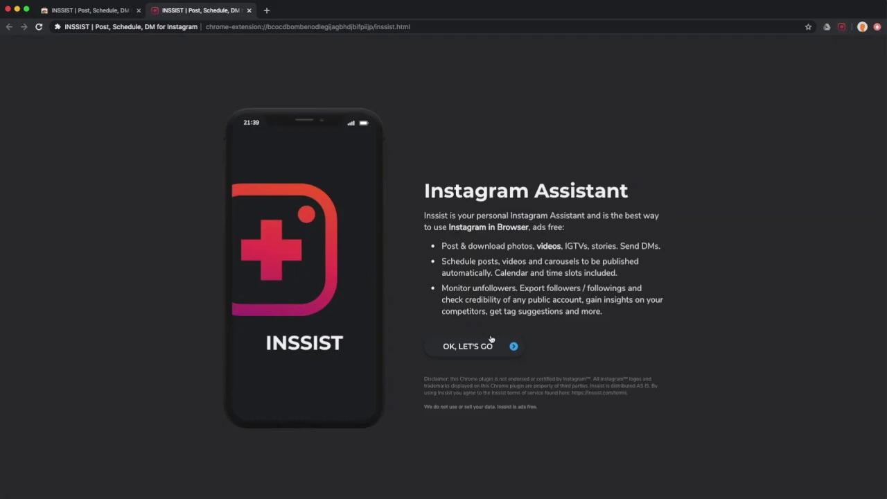 Post photos, videos, stories to Instagram from Web. Download posts and followers plus scheduling, insights and analytics IG tools. BASIC FEATURES * Post photos * Post videos ? * Post stories * Get #hashtag suggestions ? * Check if account is a spam * Download any post or story * Dark mode ? * Direct messages ADVANCED FEATURES * Multiaccount support * Pre-plan posts in a grid * Schedule posts (posted automatically, offline, even carousels) ? * Post carousels (multi-photo post) ? * See who unfollowed or followed you * Download followers of any public account * Ghost-read mode (others won't know you read their messages) ? * Check accounts for purchased / spam followers WHY INSSIST * Inssist is the only Chrome extension that supports Video uploads and is the only way to upload Videos from Desktop without sharing your Instagram password with a 3rd party app. * Inssist ensures the Photos are published with the best resolution and quality possible. Photos uploaded with Inssist are not blurred by image compression comparing to other Chrome extensions or "user-agent switch" approach ?. * Inssist allows scheduling Carousels without mobile app notifications and is the only scheduling app that does auto-posting for Carousels. DATA SECURITY * Secure. You Instagram data does not leave your PC, we do not collect, store or sell it. Ever. More at https://inssist.com/privacy * Free, Ads-Free and Just Works. Because life is too short for bad software. WHAT PEOPLE SAY ? I love it. It makes my work and life easier in uploading contents in my desktop. Brilliant solutions for Virtual Assistants and Social media Managers as well as Influencers, bloggers and creators. ? Wonderful app. It lets me scheduled my post on Pro mode, which really help for small business to plan ahead their social media game. Keep it up guys! ? This is honestly my favorite plug-in as a social media marketer. Couldn't live without it!