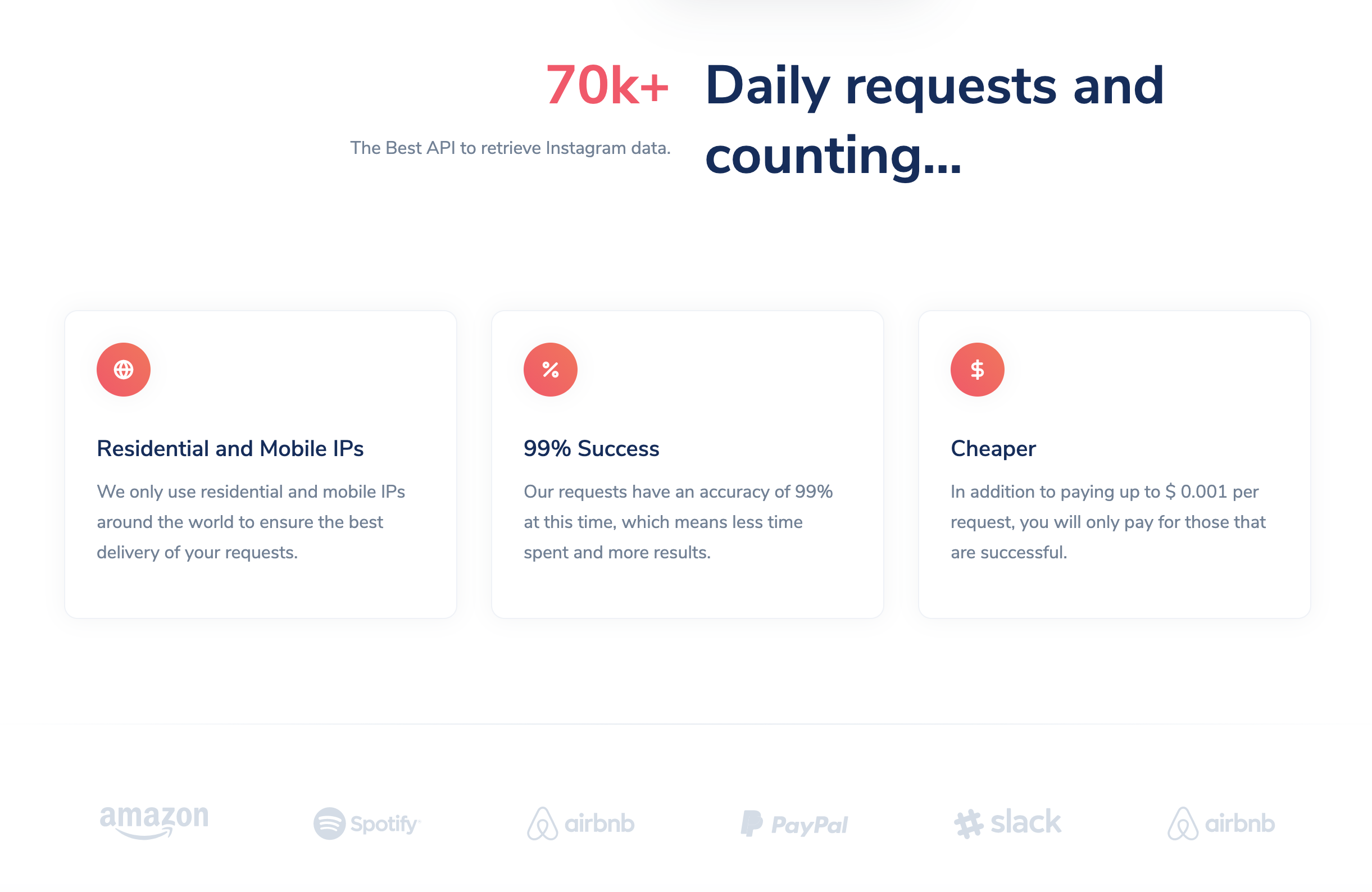 It is the simplest API to capture public Instagram Data, this API that makes use of Residential, 4G, 5G IPs to capture data in real time.