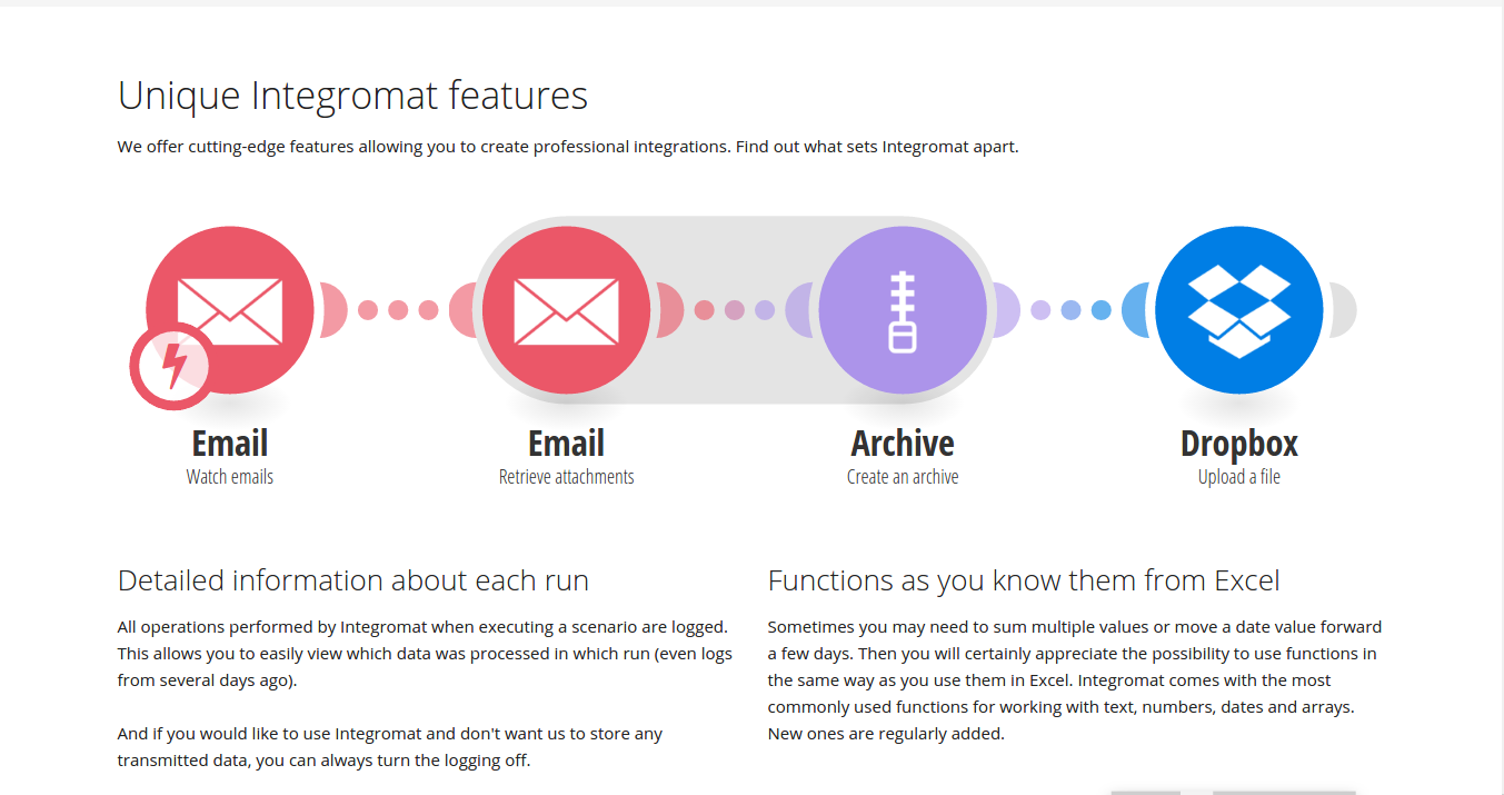 What makes Integromat unique? Perfect visualization of everything you do - Thanks to the Integromat´s visualization capabilities, you can watch in real time how your automation is executed and data flows through your scenario. Detailed information about each run - All operations performed by Integromat when executing a scenario are logged. This allows you to easily view which data was processed in which run (even logs from several days ago). Functions as you know them from Excel - Sometimes you may need to sum multiple values or move a date value forward a few days. Then you will certainly appreciate the possibility to use functions in the same way as you use them in Excel. Integromat comes with the most commonly used functions for working with text, numbers, dates and arrays. New ones are regularly added. Choose where to start Do you need to process data created before activating your scenario? No problem - Integromat allows you to easily choose if you want to retrieve.
