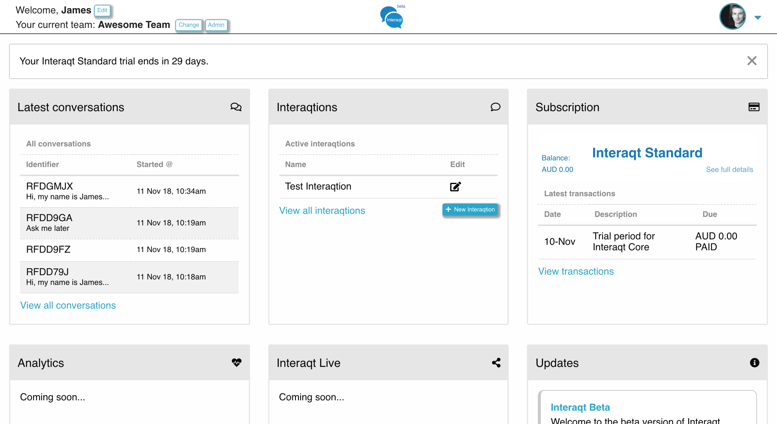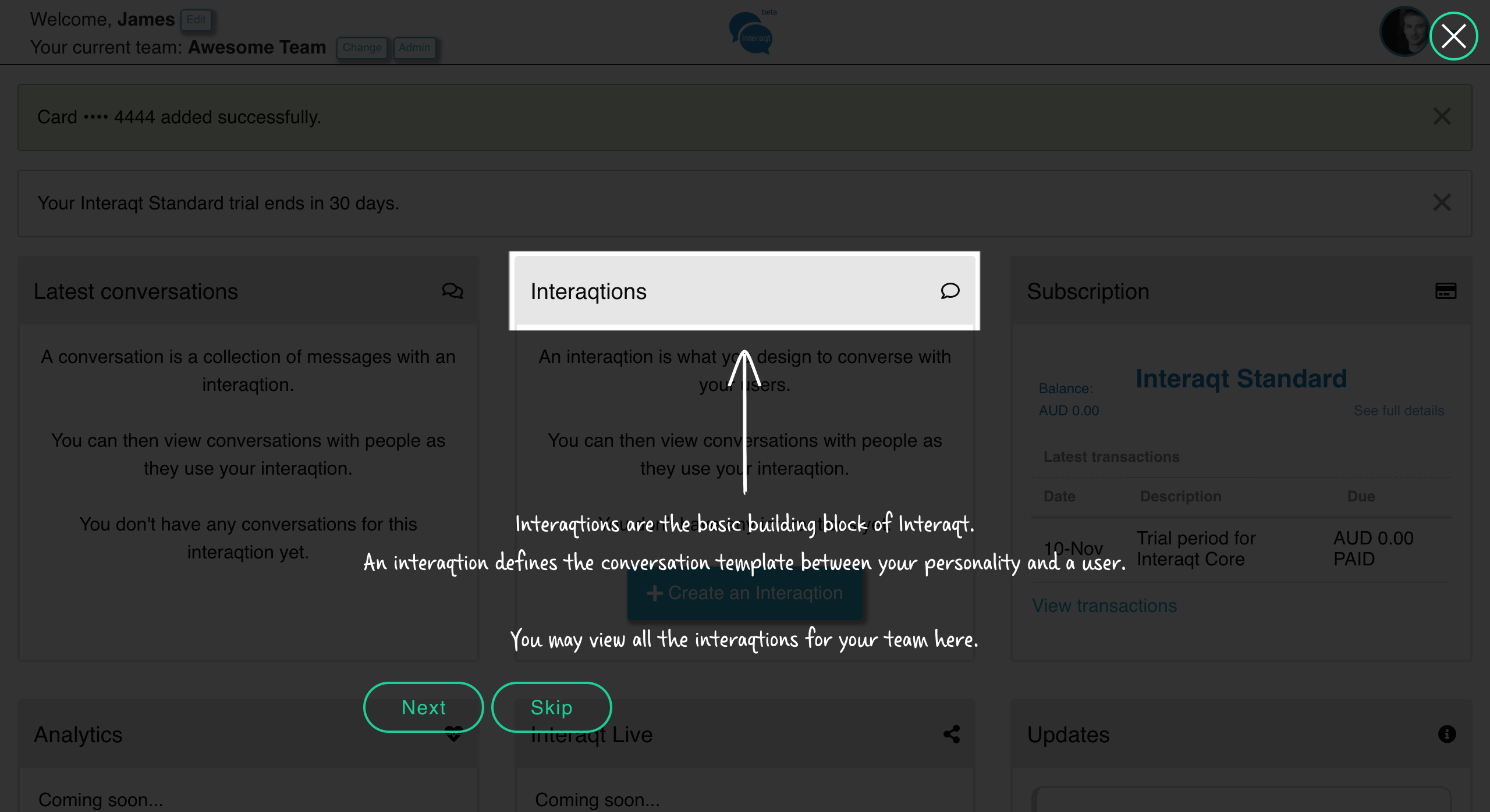 Interaqt.ai beta provides you with a platform to build conversational experiences for your web pages, application forms and servicing channels. Build with a visual interface, define the flow, include payments and test using A/B testing. Try it out today at https://interaqt.ai