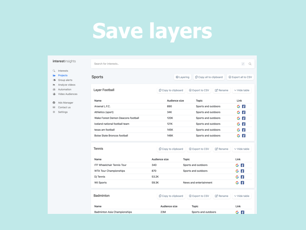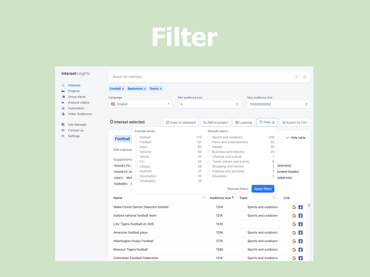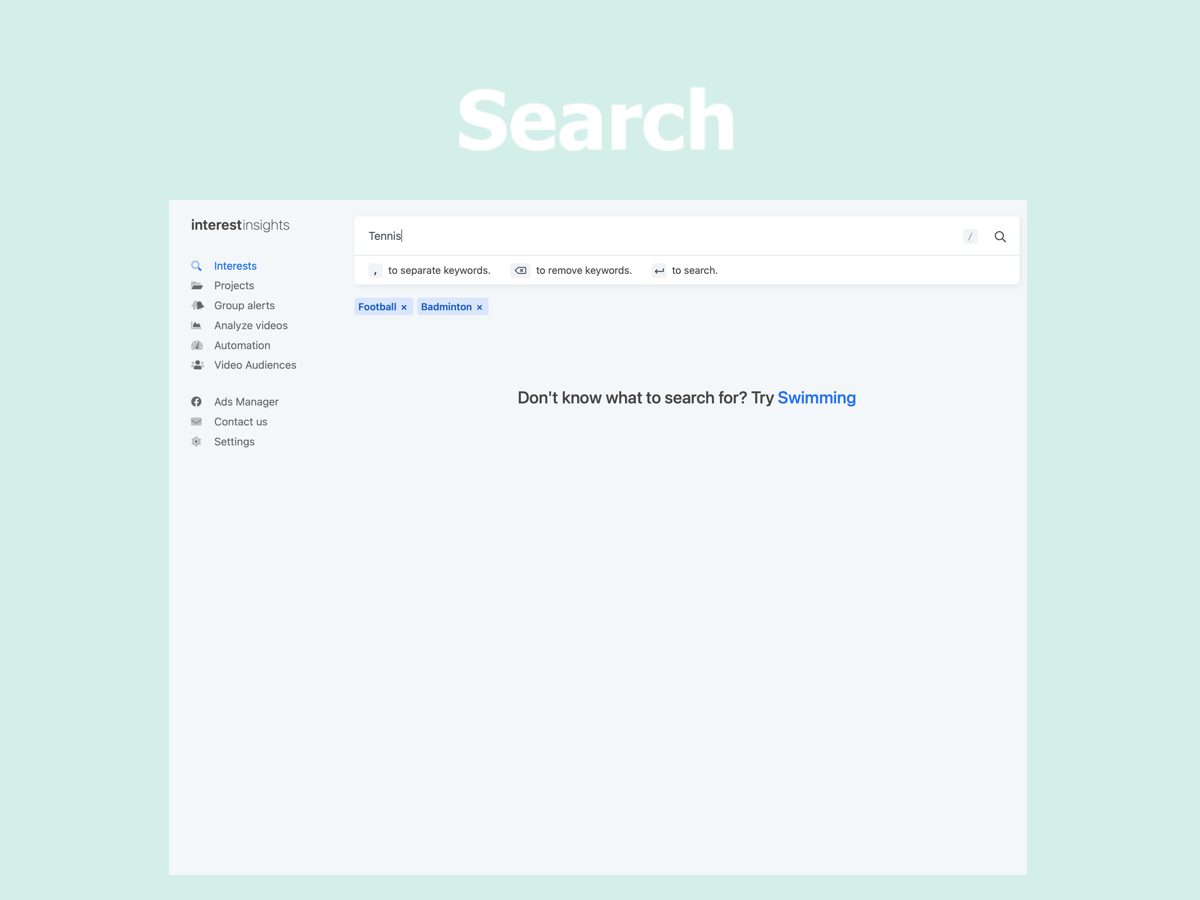 With the help from +10K beta users and their feedback, we are launching interestinsights v2 ? A new user friendly design and new features like: - Search for multiple keywords - Add suggestions for searches as keywords - Create layers for saved projects - Copy and export individual layers Since the initial launch of interestinsights, have received a lot of feedback, resulting in this new design, to optimize the workflow for Facebook advertisers, save time in the advertisers daily tasks. We launched almost 2 years ago, in a period where we have had the pleasure of introducing our platform to more than 10.000 individuals, a tremendous ride with more than 145.000 searches, 17.900.000 hidden interests found and analyzed more than 60.000 videos. If you are unfamiliar with interestinsights, it gives every Facebook™ advertisers access to all the great Facebook™ interests that can be difficult to find. Facebook shows the same 25 interests on the same search every time, so as an advertiser, you are shown the same interests as your competitors. Without hours of research, most of the good interests seems hidden, but with interestinsights, all the interests will be shown at once, and faster. Additionally do we have videos insights, that analyzes and compare your Facebook videos across multiple pages so you can make better videos for your audience and improve your audience retention. Furthermore do we have Group alerts for you to track keywords in Facebook groups and notify you when your keywords are mentioned, so you can turn group members into customers. All this for free during our beta phase ? Beta users who sign up now, will get 3 months for free when the beta ends by the end of this fall ?