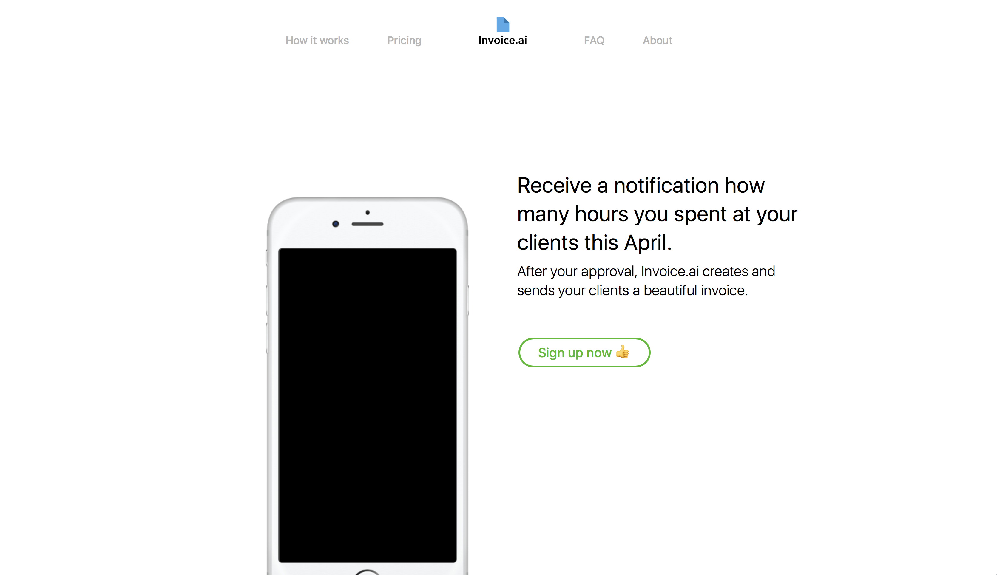 Receive a notification how many hours you spent at your clients this April. After your approval, Invoice.ai creates and sends your clients a beautiful invoice. Invoice.ai is currently in private beta.