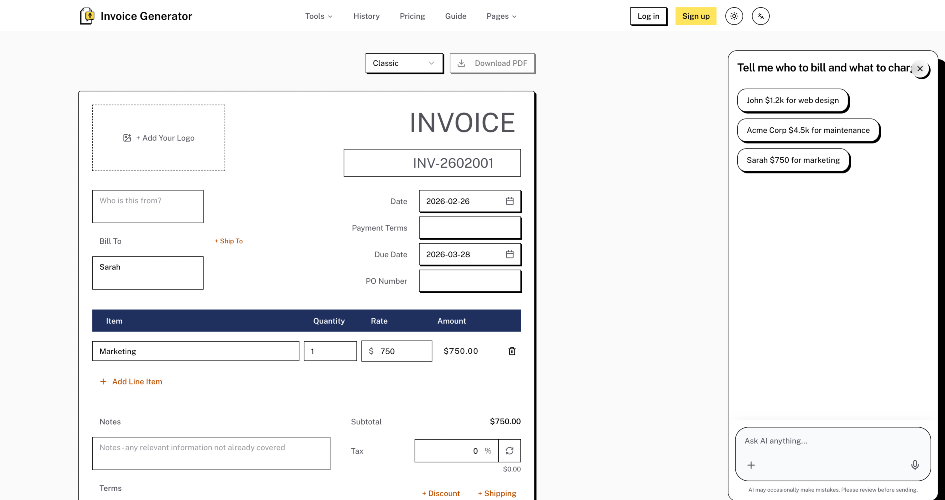 On invoice-generator.cc, the Details / Invoice Variables you fill in are essentially: Invoice Number (sequential, e.g., INV-001), Date (issue date), and Due Date / Payment Terms (when you expect payment, e.g., Net 15 / Net 30 / Due on Receipt)