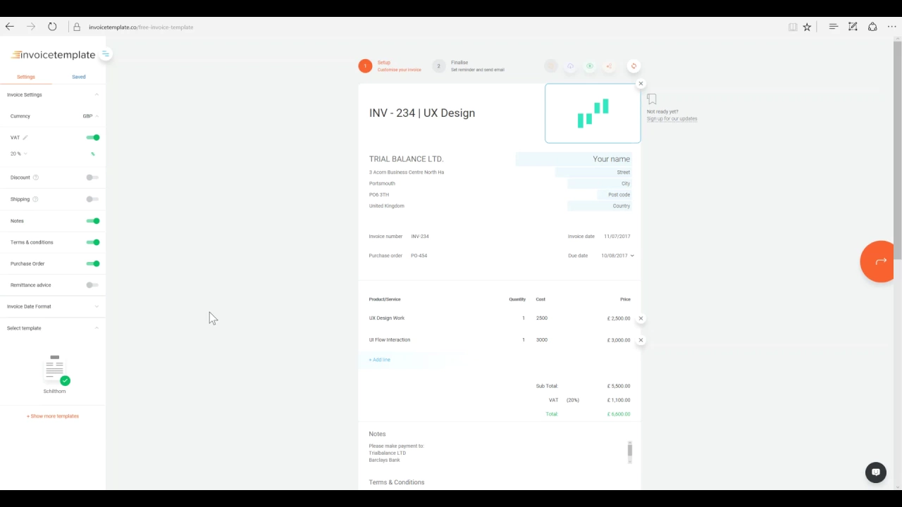 Invoice Template is a free, online tool for small business owners that allows you to create and send beautiful invoices in seconds. Forget Excel, Word, Google Docs or PDF, our software allows you to edit blank invoice templates with your details to create simple and smart invoices. Add, remove or edit fields, drop in logos and generate downloadable PDFs or save your invoices to our dashboard. No login or sign-up forms required. Then set automated reminders to chase up payment without you doing a thing. With Invoice Template you always get paid on time, regardless of where your clients are in the world.