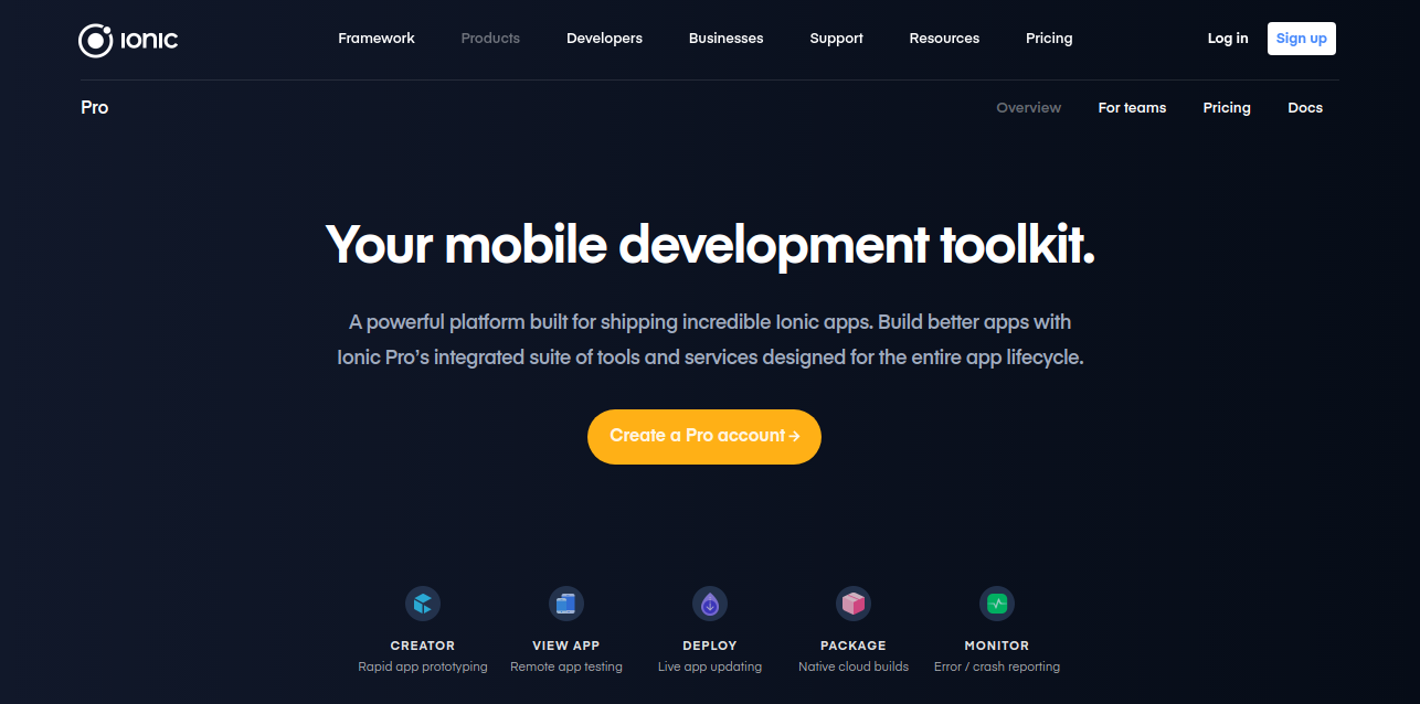 A powerful platform built for shipping incredible Ionic apps. Build better apps with Ionic Pro’s integrated suite of tools and services designed for the entire app lifecycle. Everything in one experience. Spend more time on what matters. Ionic Pro takes care of the rest, with a suite of powerful mobile development tools and services for apps of all shapes and sizes -Better apps Build apps your users will love, with simple app sharing, feedback and monitoring to craft the perfect app experience. -Faster development Quickly prototype and test new concepts, and speed up development to bring more ideas to market in less time. -Happier devs & teams Keep it simple with developer-friendly tools, easy collaboration, and everything you need in one place.