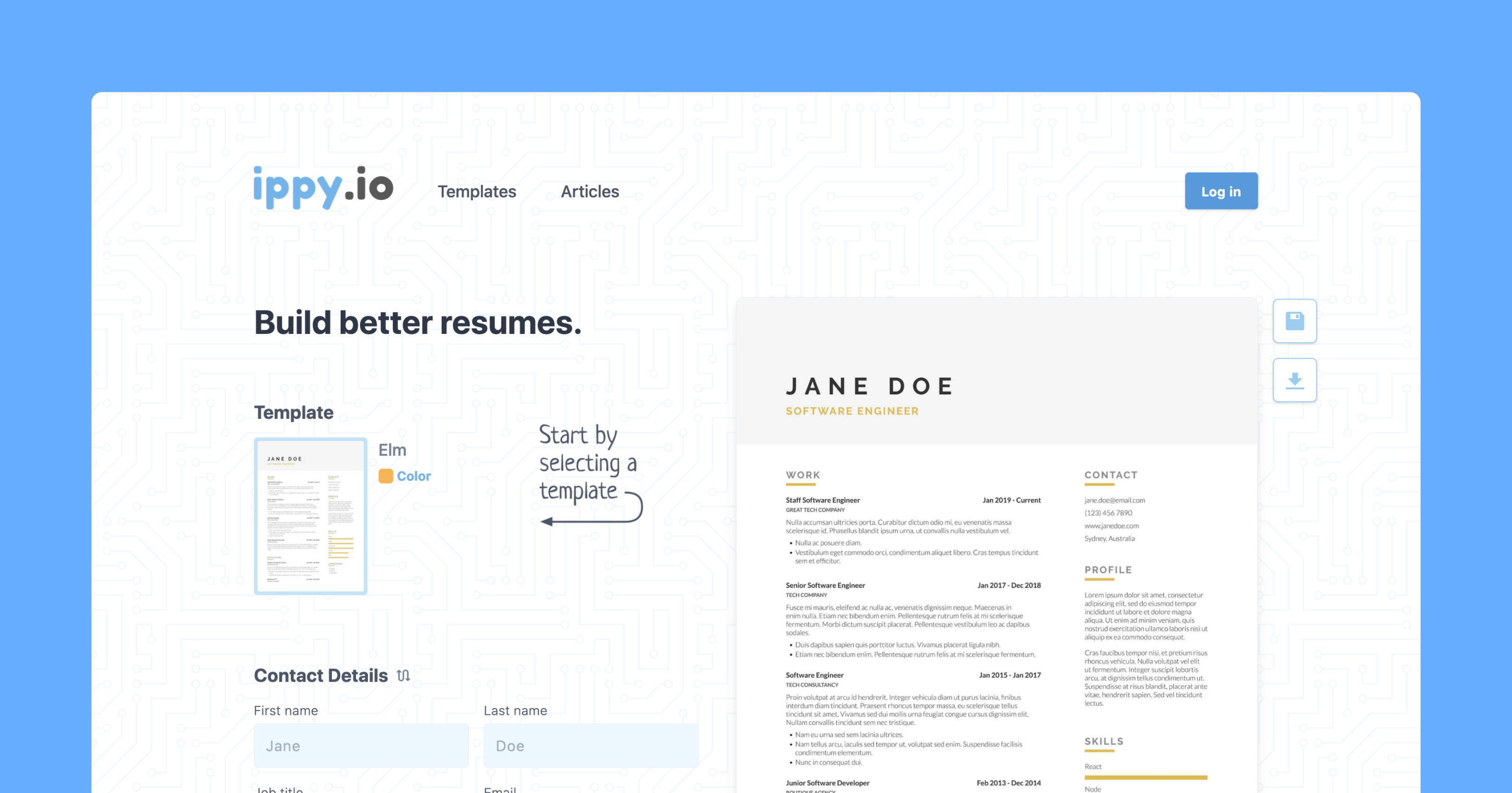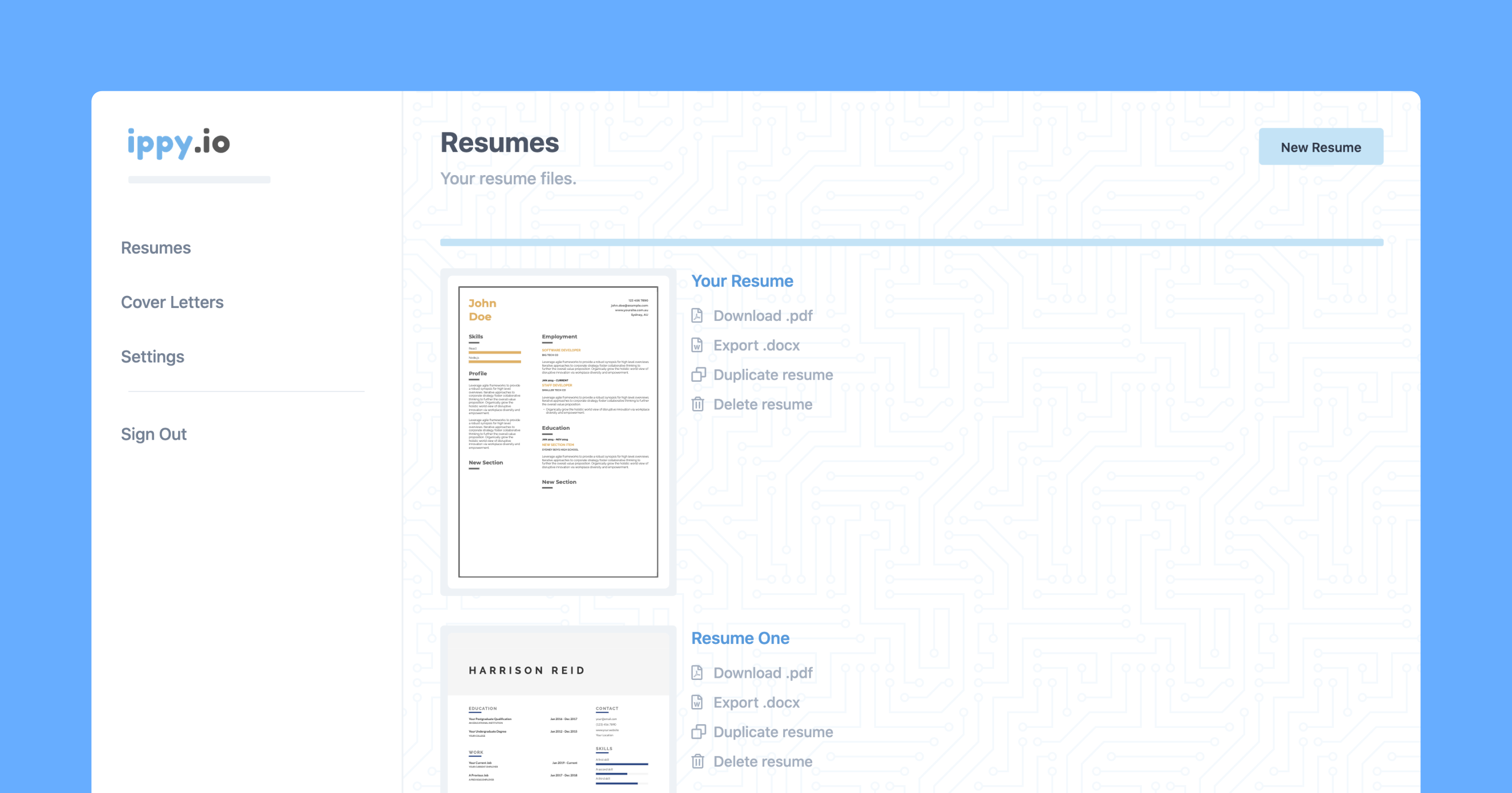 Build an eye catching resume in minutes, then go land the job of your dreams. Ippy.io is the easiest way to create a well designed and formatted Resume or CV. We offer a variety of templates, and are working on more all the time. Once you've completed your resume, it's one click to download to PDF. And it's completely free, with no strings attached.