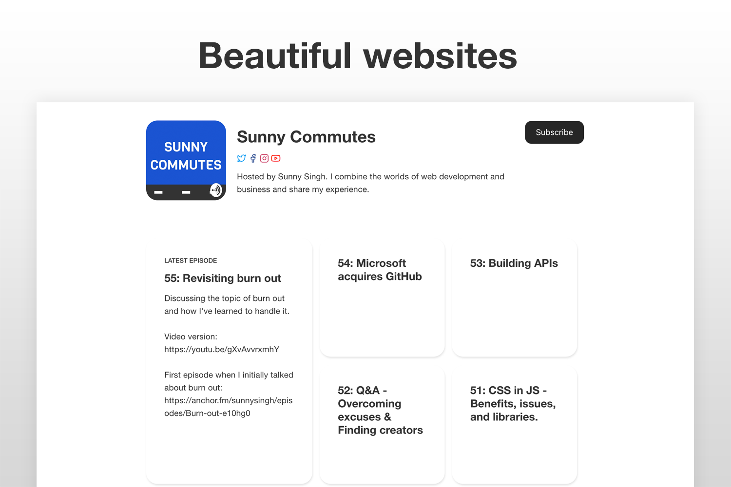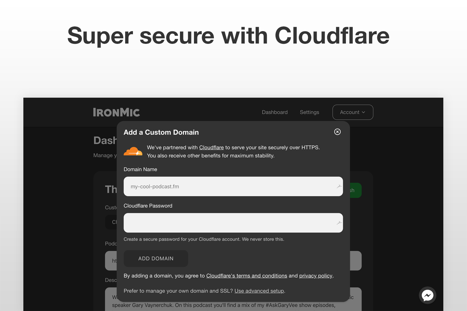 IronMic is a simple website host for podcasts. The process takes minutes to build a simple yet functional website. Start by plugging in your RSS Feed and filling in the host information. Then you'll have a simple podcast website that you won't have to update as you record new episodes.