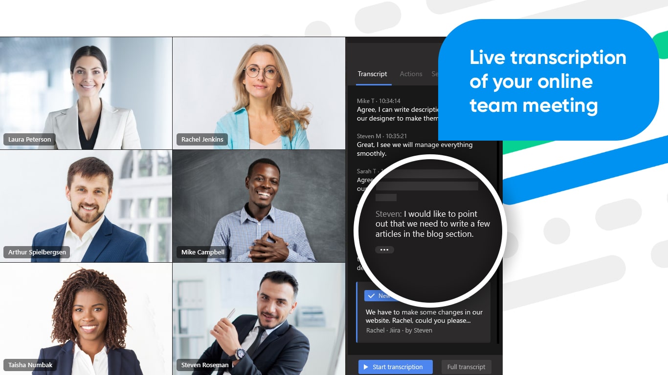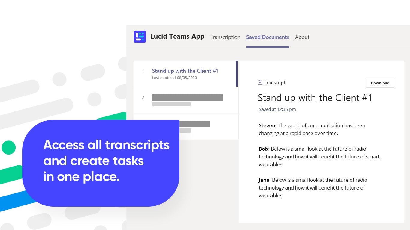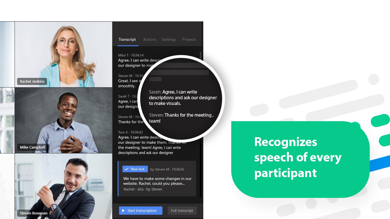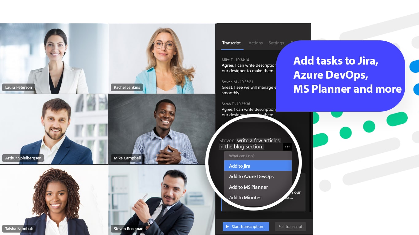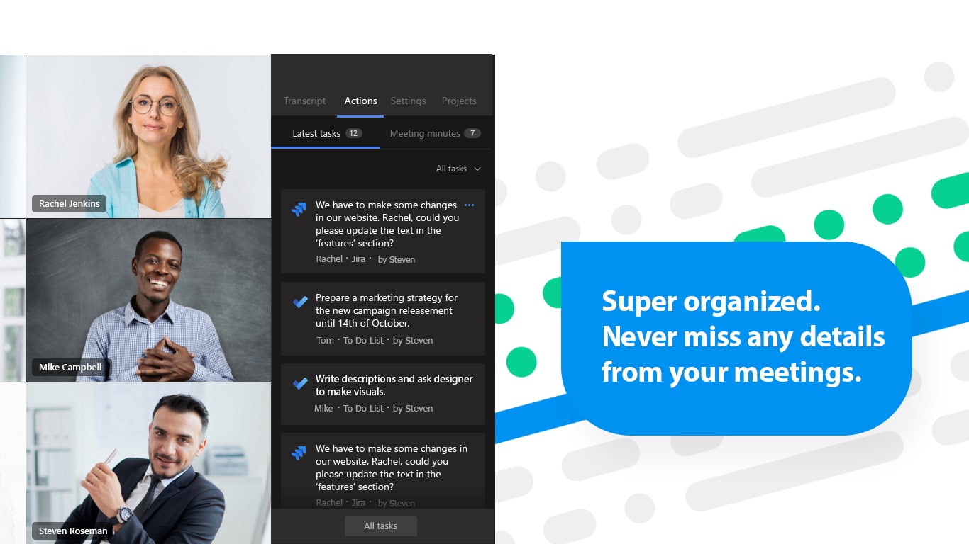 We connect your existing project management software with Microsoft Teams, so you could easily create tasks and meeting minutes without typing during the call. Focus on conversation, ask call participants for detailed explanations and simply mark from transcription all that’s important. Now you have time for this. And if anything is forgotten - you have a place to look at after the meeting.
