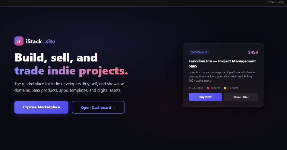 iStack.site is the premier marketplace for indie developers — buy, sell, and showcase domains, SaaS products, apps, templates, games, and digital assets. Features: • Glassy modern UI with smooth animations and rich media • Secure marketplace with payment processing • Portfolio hub for indie developers and makers • Browse and discover indie products across categories • Create and list your own products for sale • Community for serious builders and digital creators • Advanced search and filtering by category Built for indie hackers, makers, and digital asset creators who want a beautiful, professional platform to buy and sell their work.