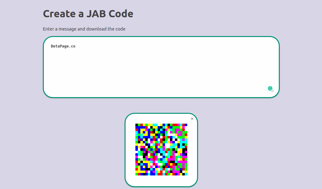 JAB Code is a color two-dimensional matrix symbology whose basic symbols are made of colorful square modules arranged in either square or rectangle grids. JAB Code has two types of basic symbols, named as master symbol and slave symbol. A JAB Code contains one master symbol and optionally multiple slave symbols. Master symbol contains four finder patterns located at the corners of the symbol, while slave symbol contains no finder pattern. A slave symbol can be docked to a master symbol or another docked slave symbol in either horizontal or vertical direction. JAB Code can encode from small to large amount of data correlated to user-specified percentages of error correction.