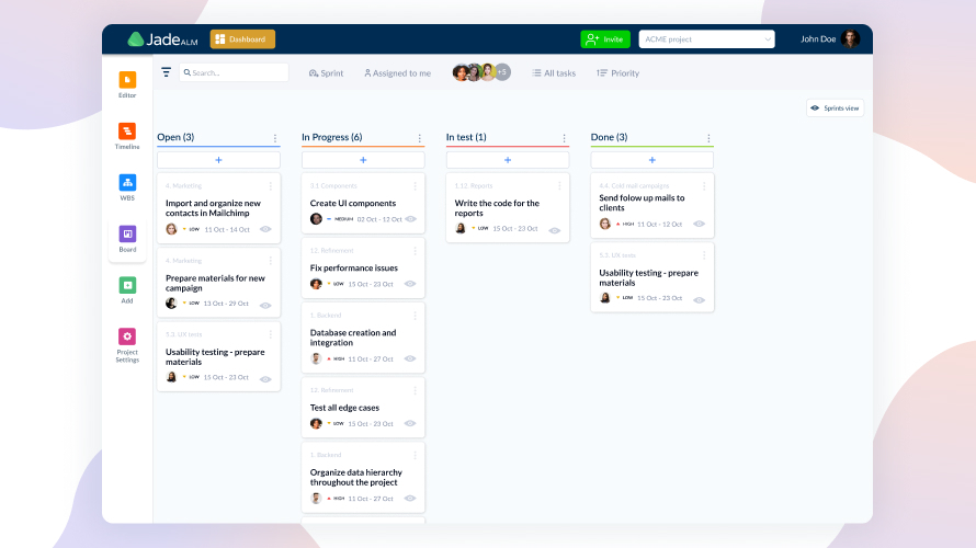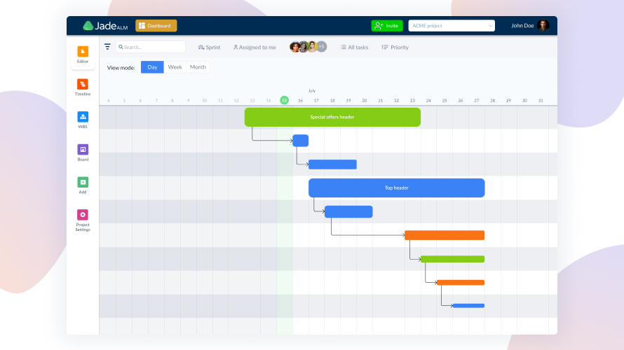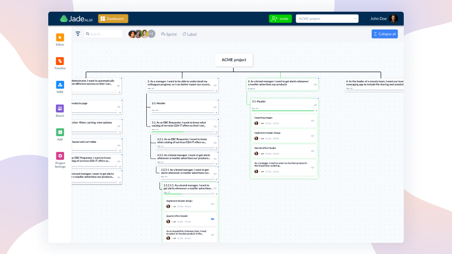 Unlike other top project management tools, JadeALM offers you a document editor with an intuitive hierarchy. You can collect knowledge about the project inside of the structurally organized editor and JadeALM automatically makes a WBS of your notes and requirements. Good road mapping, intuitive hierarchy, and structural written requirements make it easier to have a clear picture of the whole project. You can easily notice how bugs, dependencies, and related tasks influence other tasks on a low and high level. Inside the text editor, you can also add comments, assign tasks, add the dates and have them all synced with a timeline too, which enables you to see the progress of each task.