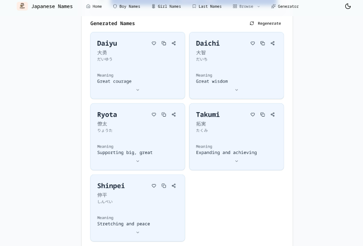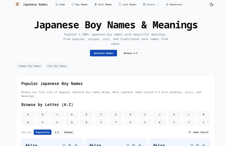Generate authentic Japanese names instantly with our free Japanese Name Generator. Create personalized names for babies, characters, or pets, complete with kanji, readings, and meanings. Customize by gender (male, female, unisex), theme (nature, strength, beauty), and meaning. Our tool offers precise control over name generation, including options for first letter filtering and detailed meaning explanations. Discover unique Japanese last names and family names, and explore trending name pairs.