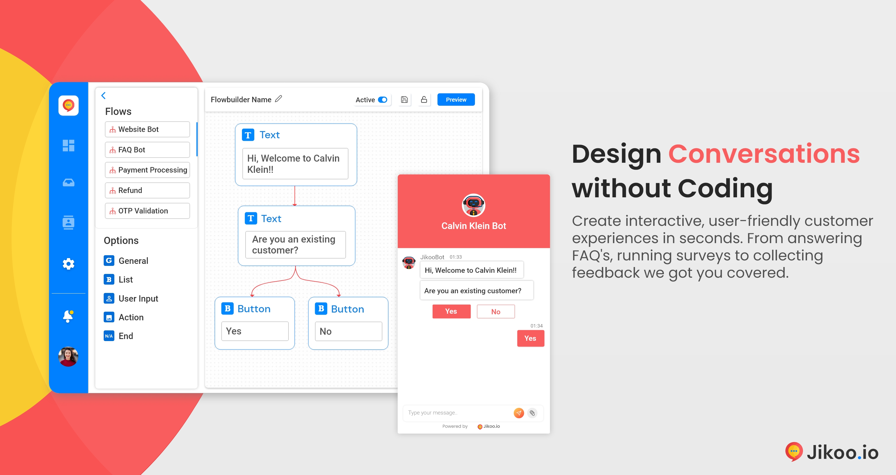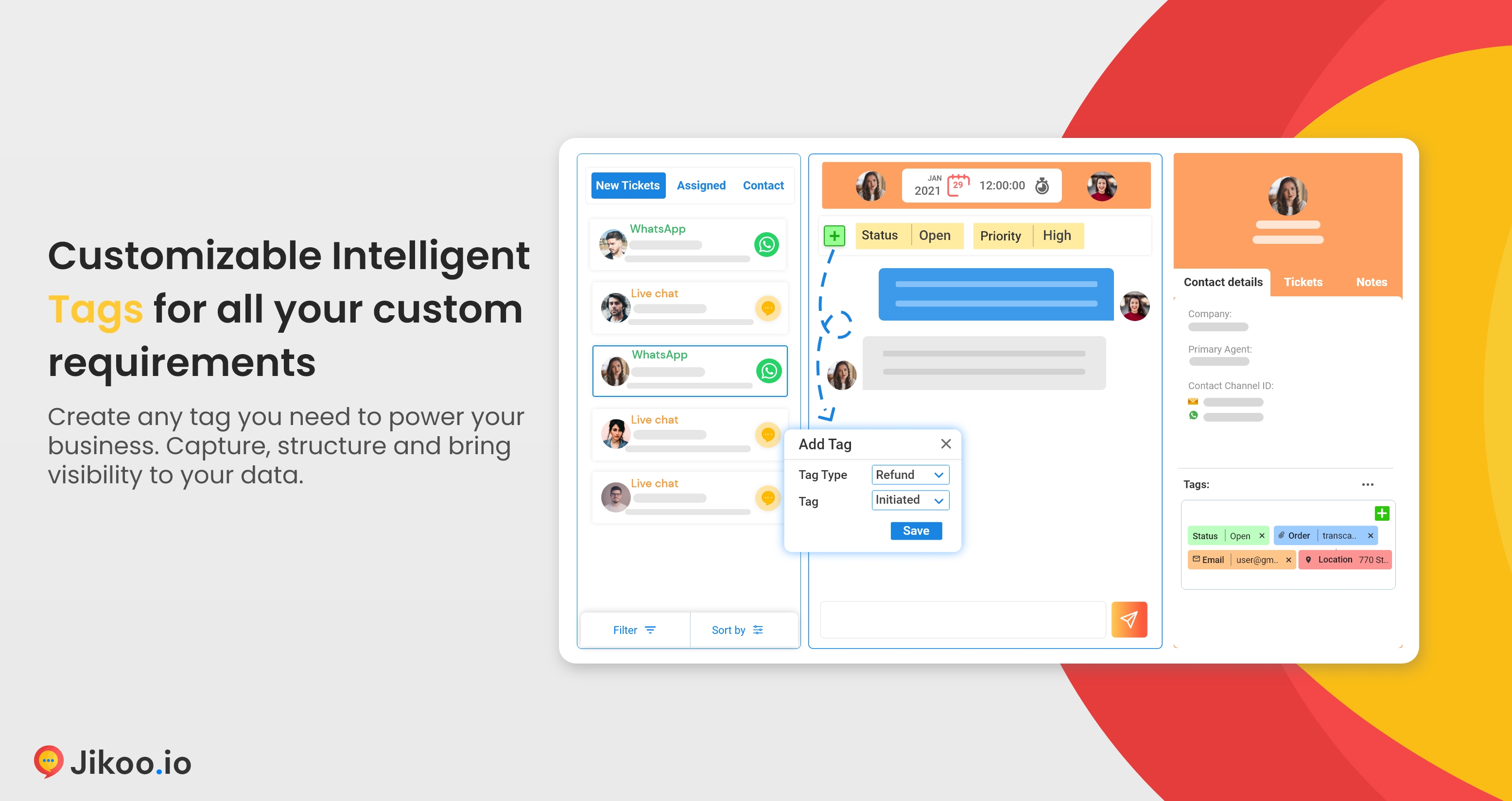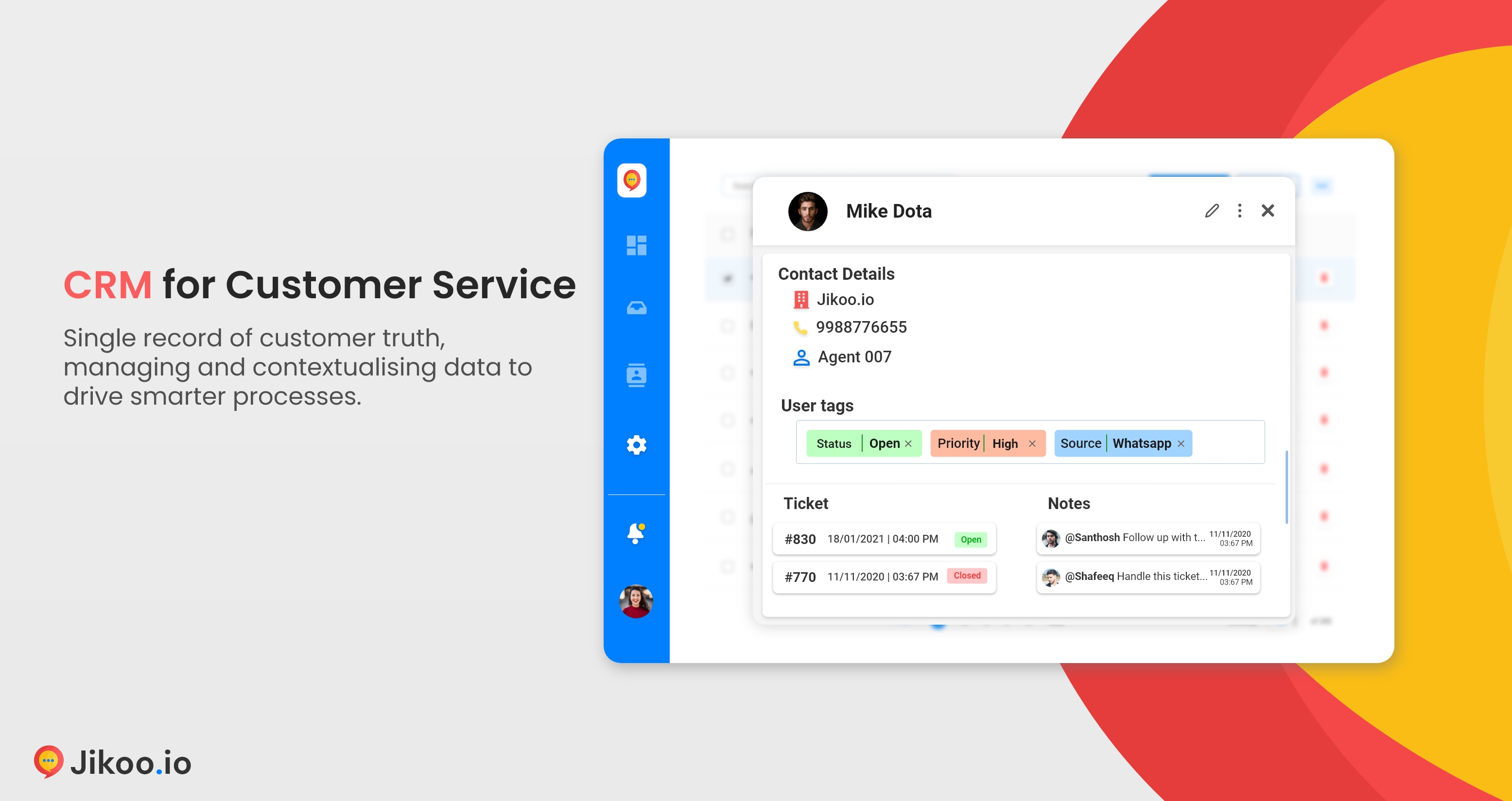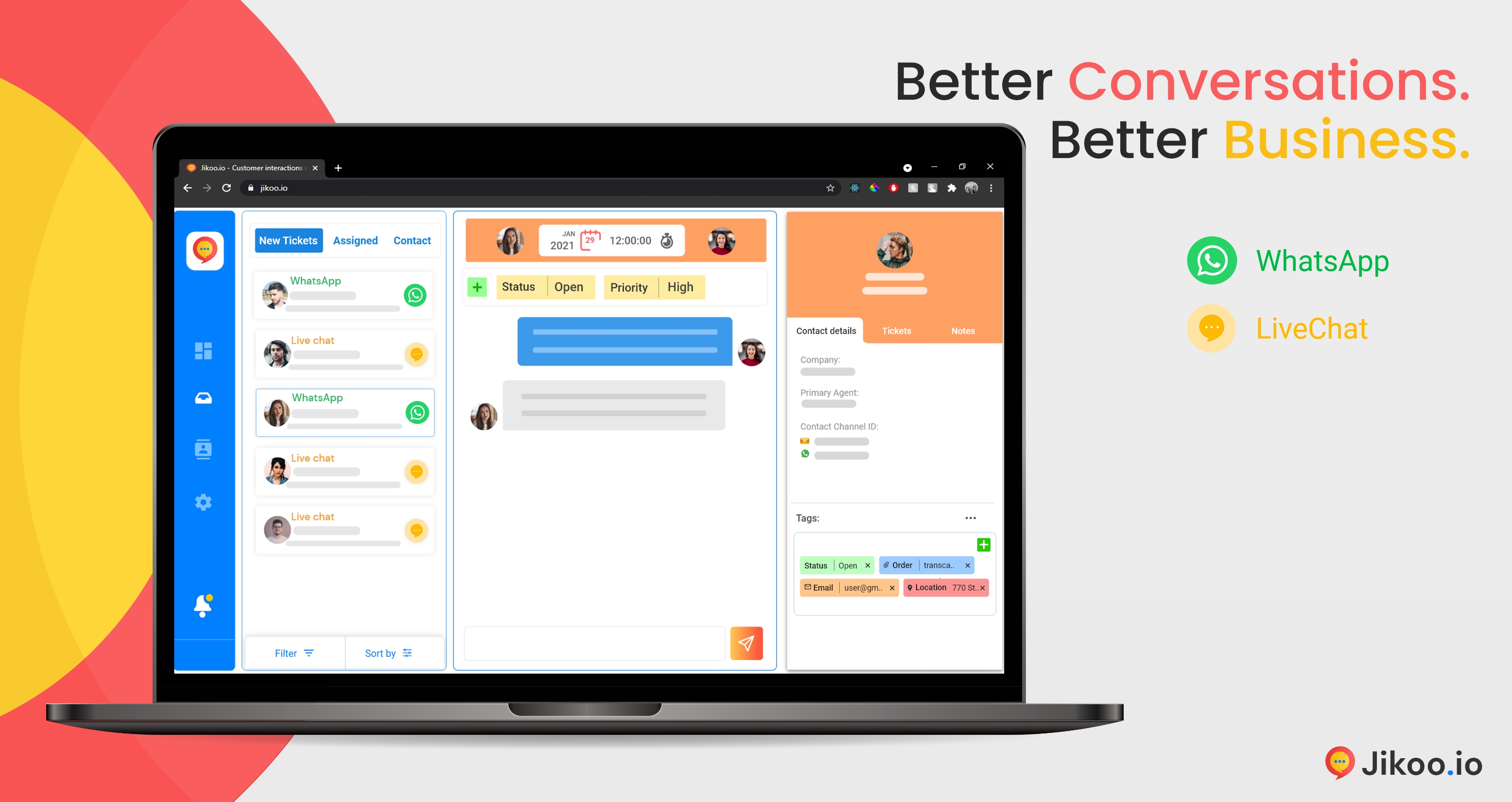 Jikoo is a simple customer interaction management platform. Customers can interact with you using Livechat or Whatsapp. Create, assign and close tickets effortlessly. Use our No-Code flow builder to create chatbots seamlessly. Chatbots can be configured to resolve customer queries, order booking, appointment booking, meeting reminders, or any other use cases. Intelligent tags can be used to capture, structure, and bring visibility to your data.