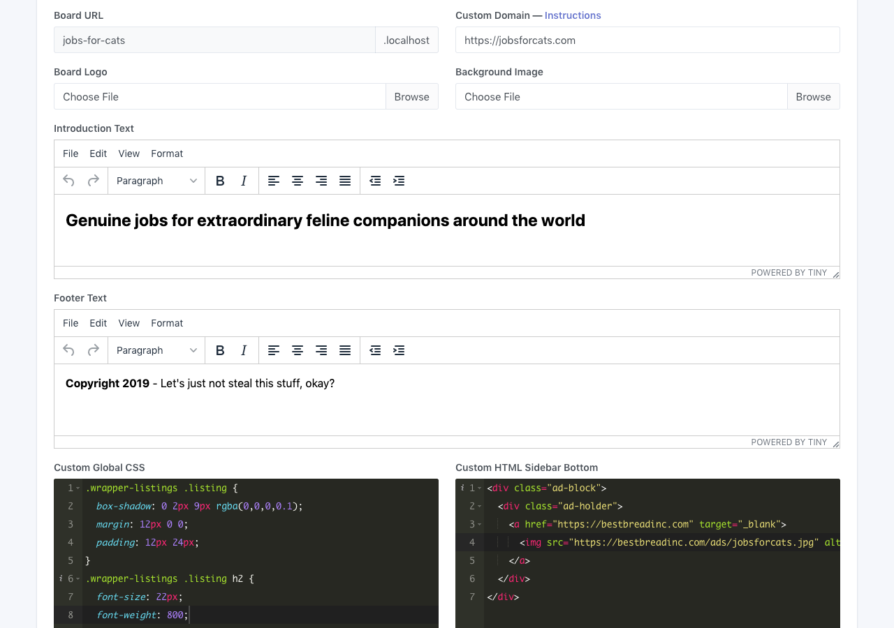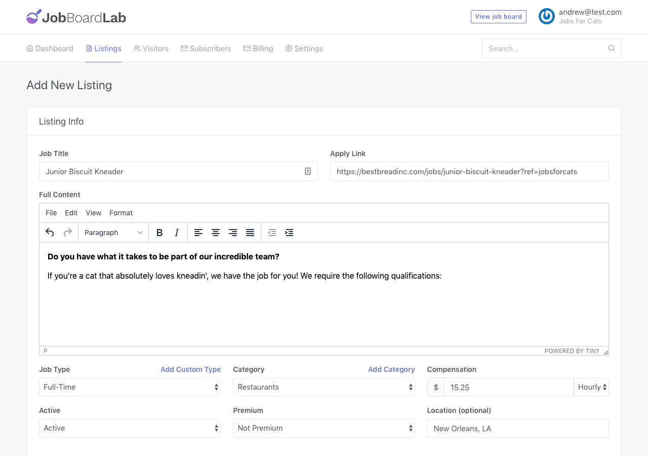 JobBoardLab is a fully-featured web app to help you create, manage, customize, and monitor an online job board. If you've ever wanted to create a site like remoteok.io, larajobs.com, or authenticjobs.com, this is exactly what you're after! In addition to just posting open positions, you can also view every visit and "Apply" link clicks on each individual listing. Detailed reporting in an online dashboard shows trends over time, including what your most popular categories are, or what words are most frequently searched for. Connect a Stripe account to enable paid listings and even import jobs from Indeed. A free, open-source package is available if you want to host on your own hardware.