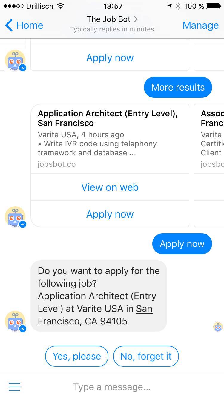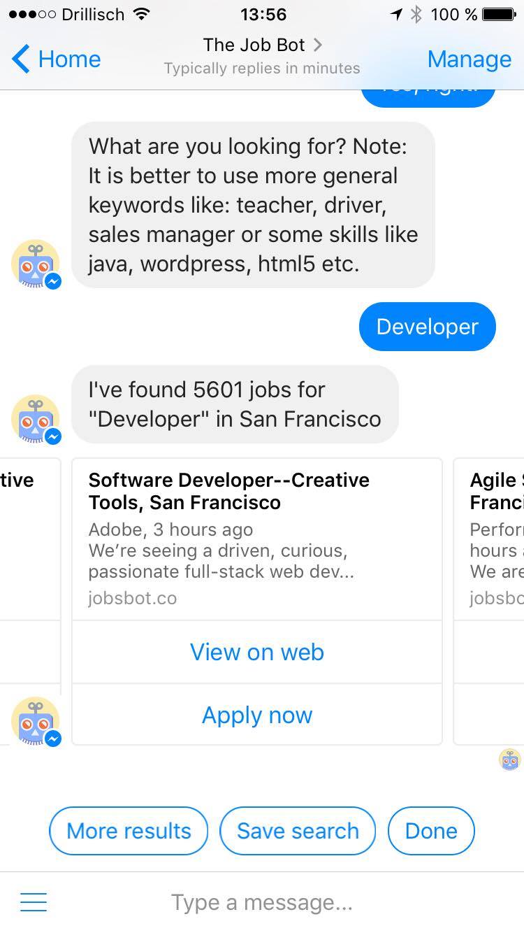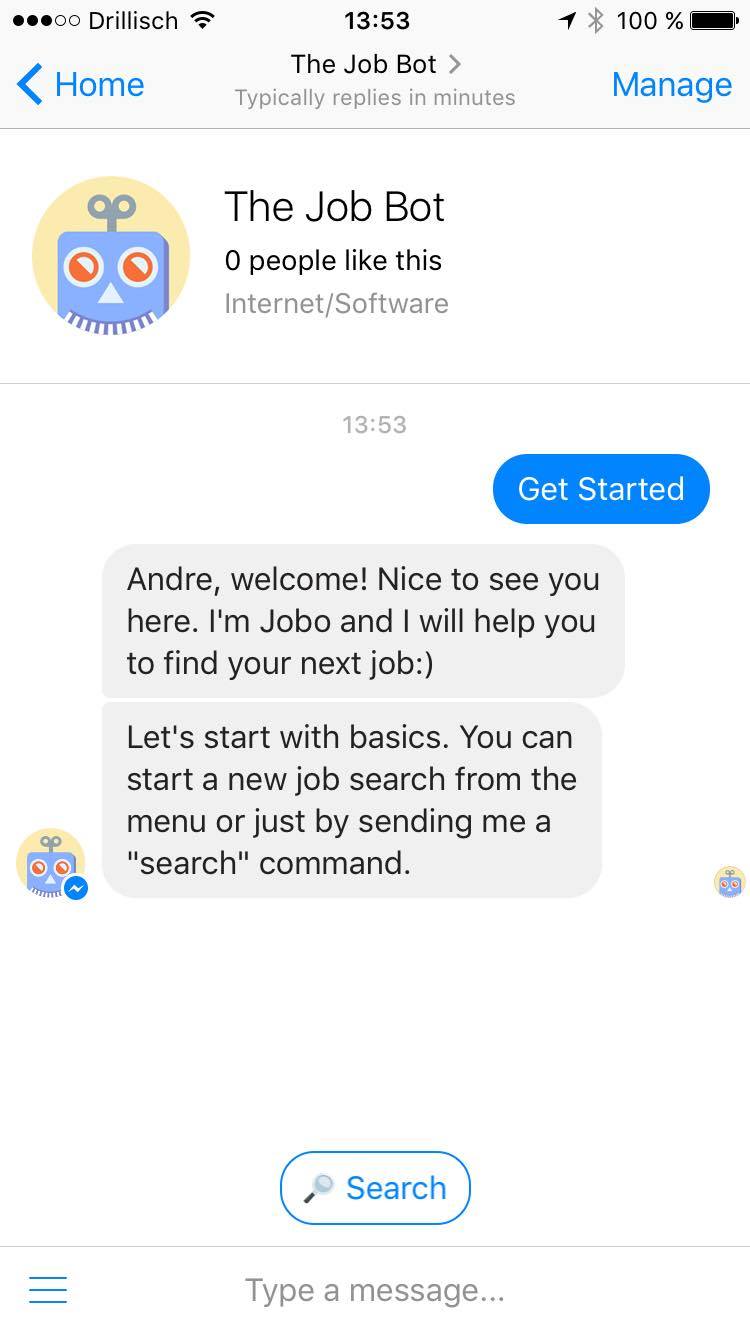 JobBot is an AI powered HR chat bot pioneer. He helps humans to find new jobs and helps companies to hire talents all around the world. In the near future JobBot will be able to handle job applications, match candidates and jobs and even do the first interview;)