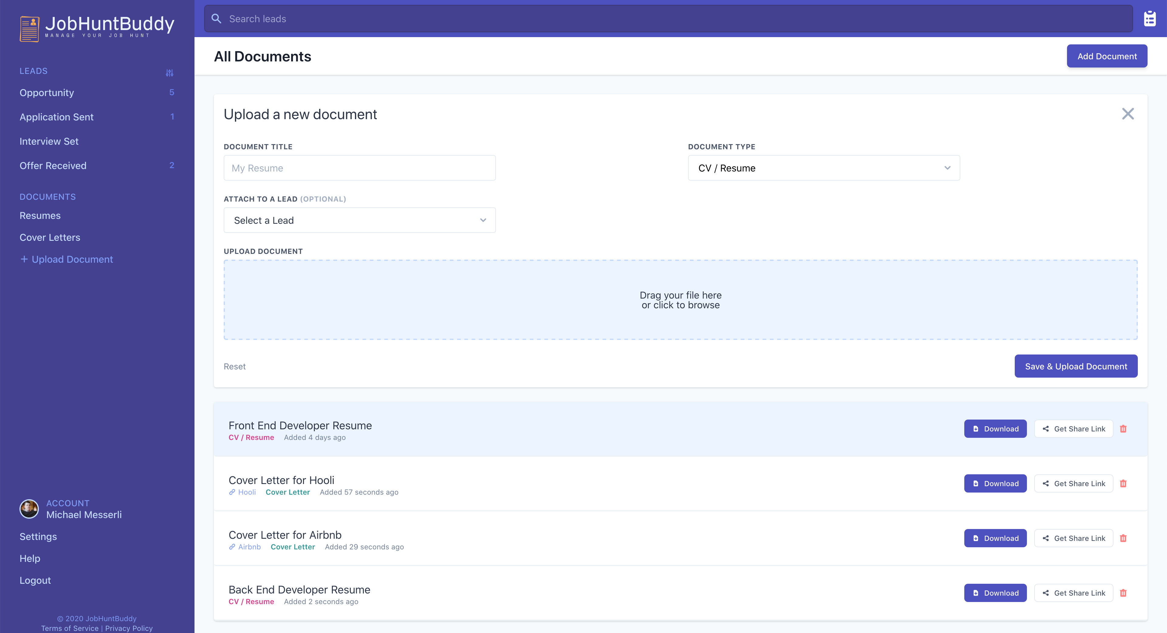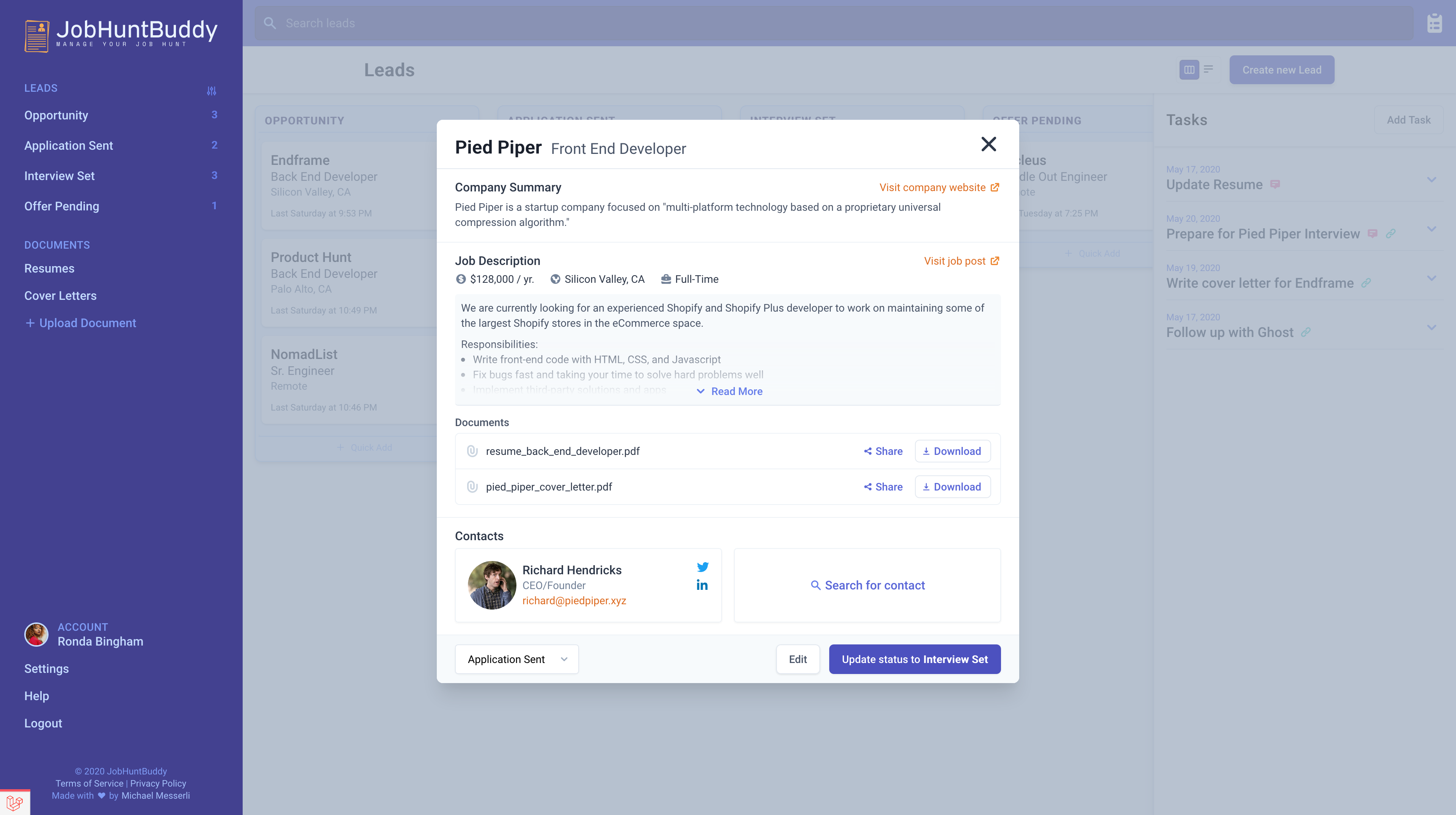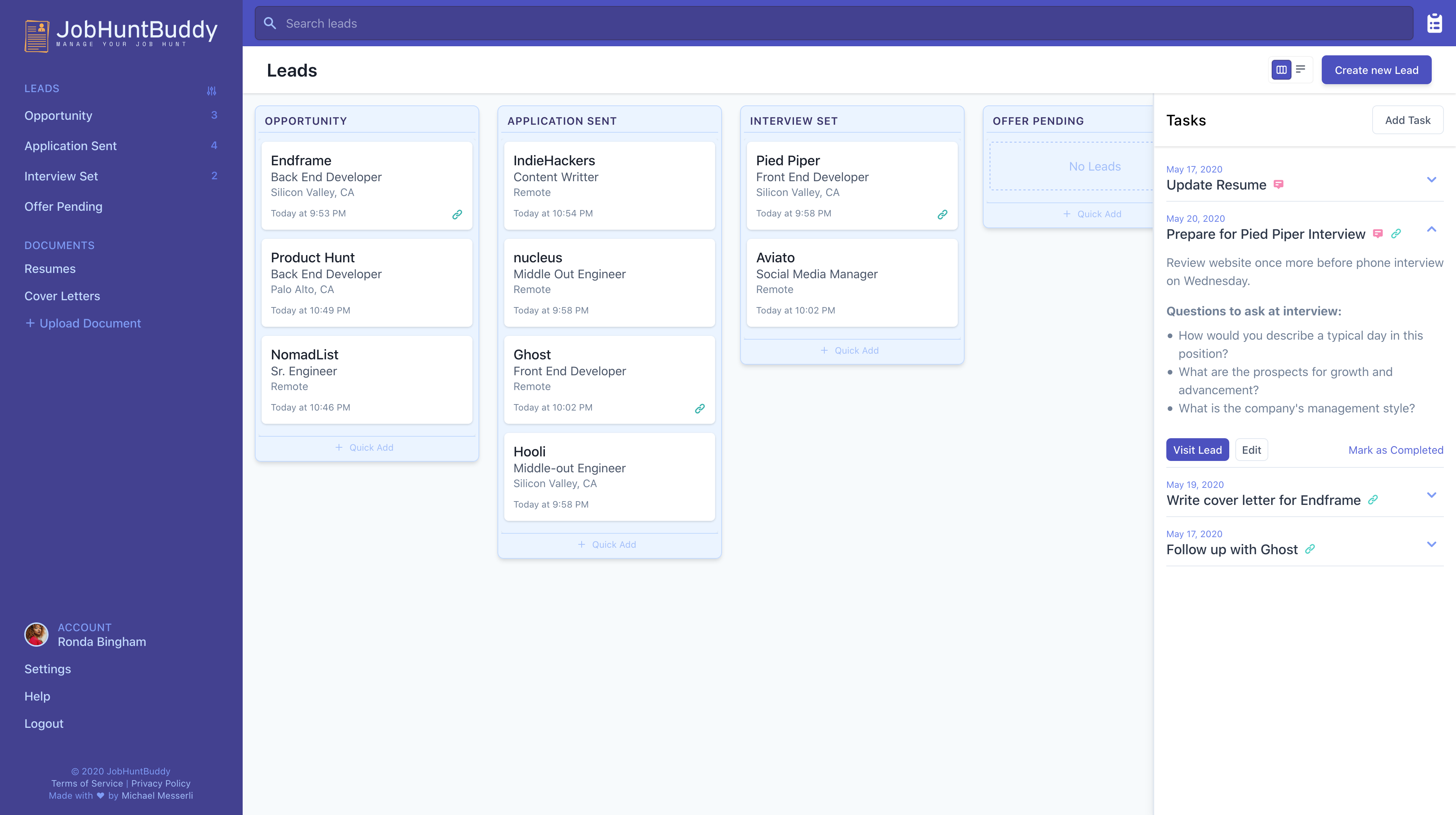 JobHuntBuddy is a job application tracking app that helps users stay organized while seeking a new job. By tracking the status of your leads, creating tasks and reminders, and keeping all of your resumes and cover letters in one place you'll always know what step to take next. With JobHuntBuddy users can: - Track leads using their own flow of 'statuses', or use our defaults: Opportunity -> Application Sent -> Interview Set -> Offer Received - Move leads between statuses using a kanban board or list view - Create tasks and set reminders to follow up with certain applications - Upload & manage documents (eg. resume or cover letter) which can be downloaded or shared directly from JobHuntBuddy JobHuntBuddy will be available soon. Early access reservations are now live at https://jobhuntbuddy.co.