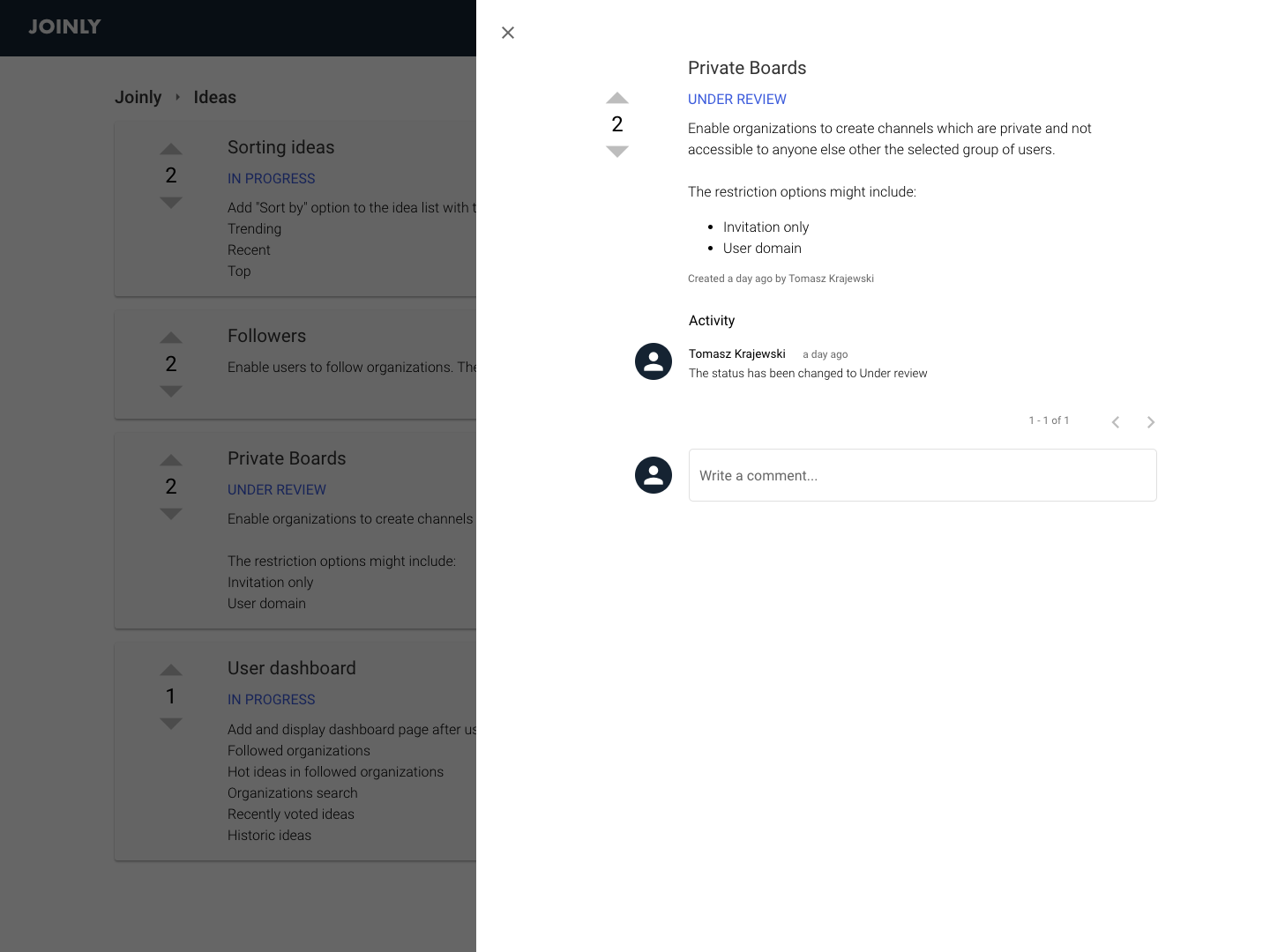 Joinly.xyz is a community platform to collaborate on products, projects, brands and organizations. Users can share their ideas, give feedback, discuss issues and help companies to get better at things that customers care about. - Collaborate with your customers - Get feedback and comments - Discuss ideas Unlock potential of your business by understanding what your community is driven by so you can make informed decisions about your product, project, brand or organization direction.